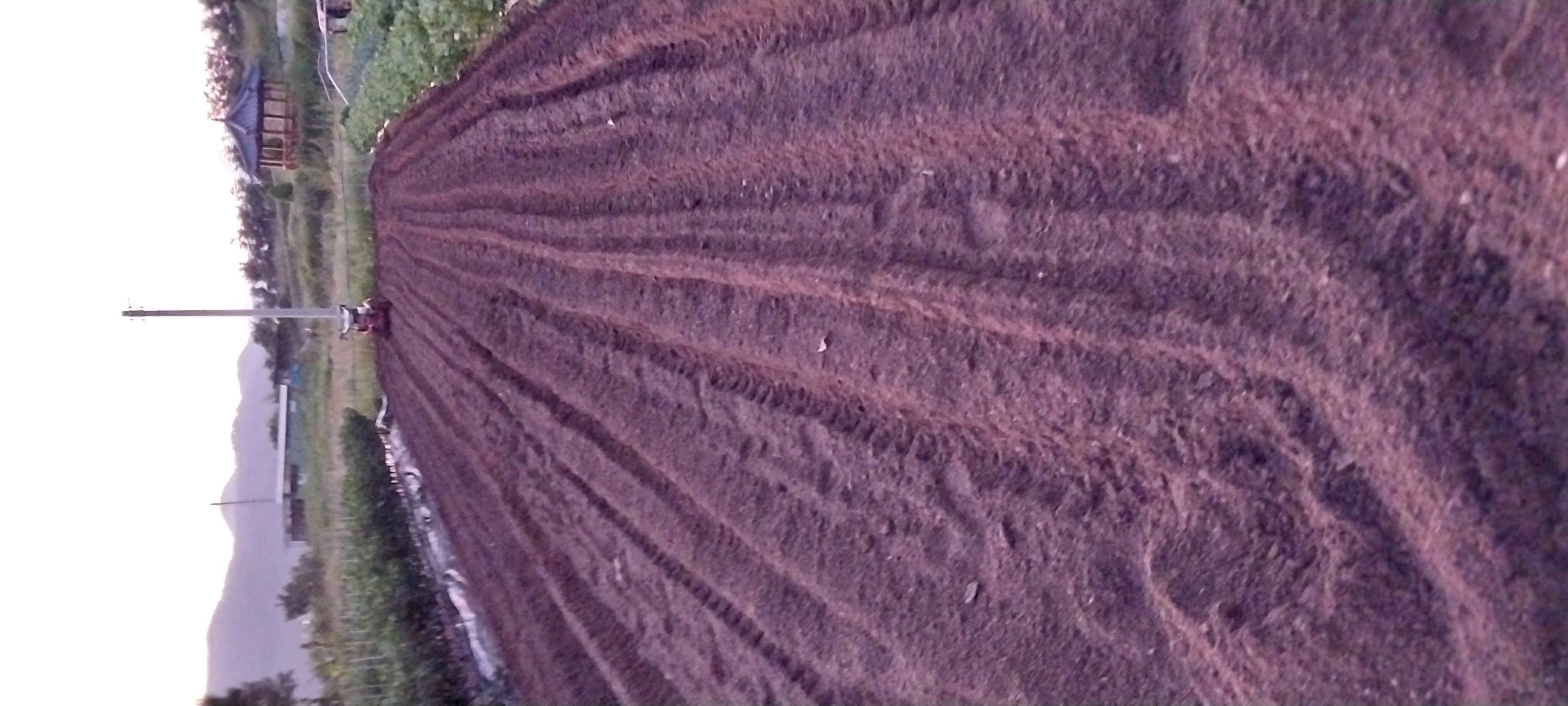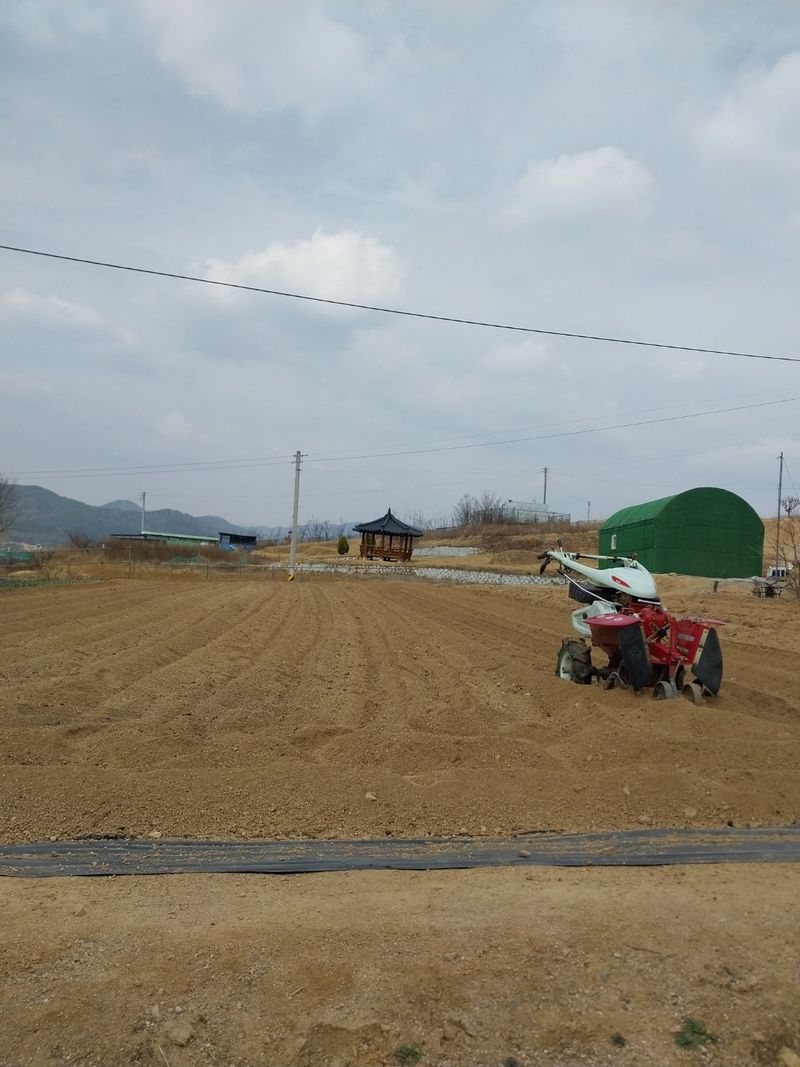 며칠 전 퇴비와 비료를 흩어 놓은 땅에 로타리 작업을 마치고 두둑을 만들어 비닐 멀칭을 씌웠다. 비닐 멀칭은 감자 수확 때 걷어 놓은 비닐을 재활용 했다.