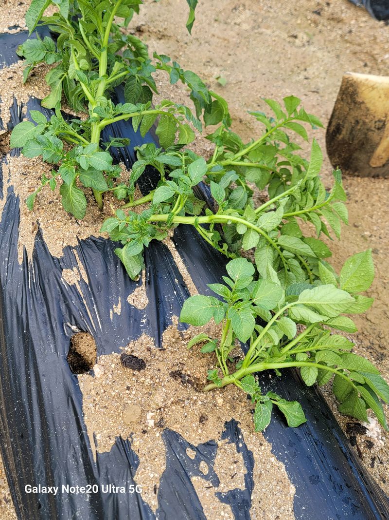 25/4/2/ 수요일. 맑음. -2. 15 밭에. 살충제 거름 비료 살포후, 두둑 만들고 비닐 씌움 감자(두백 ) 심었음
