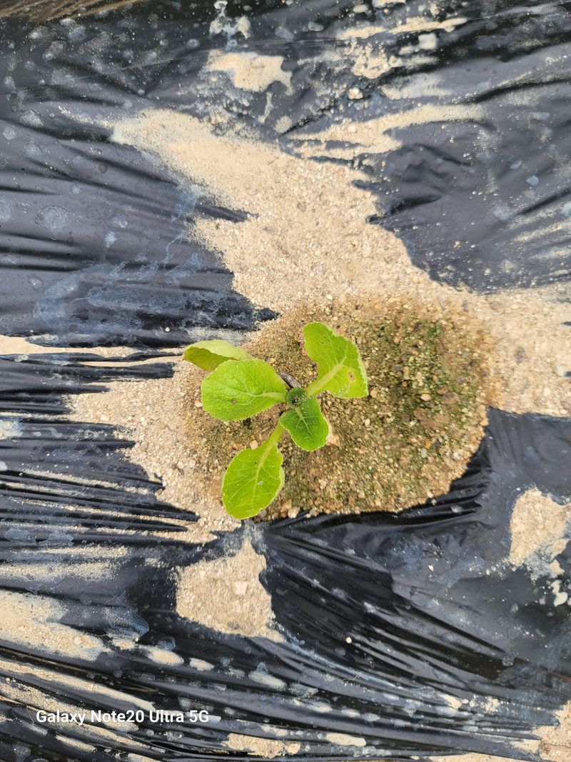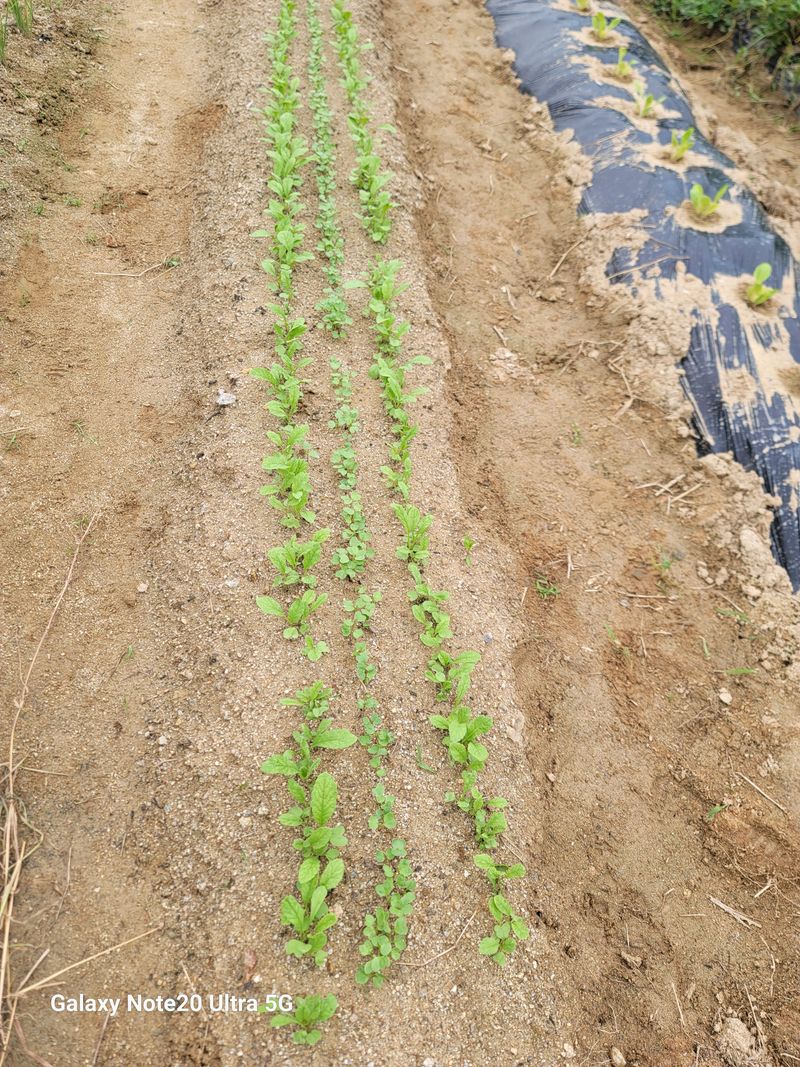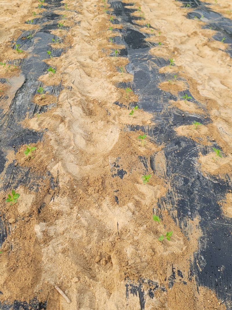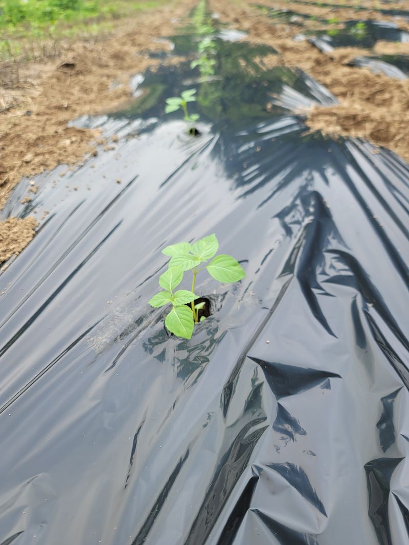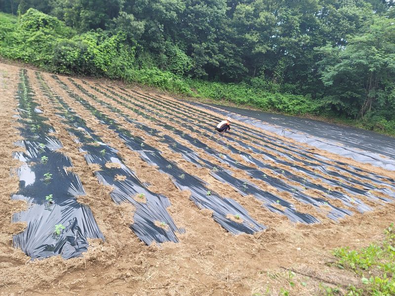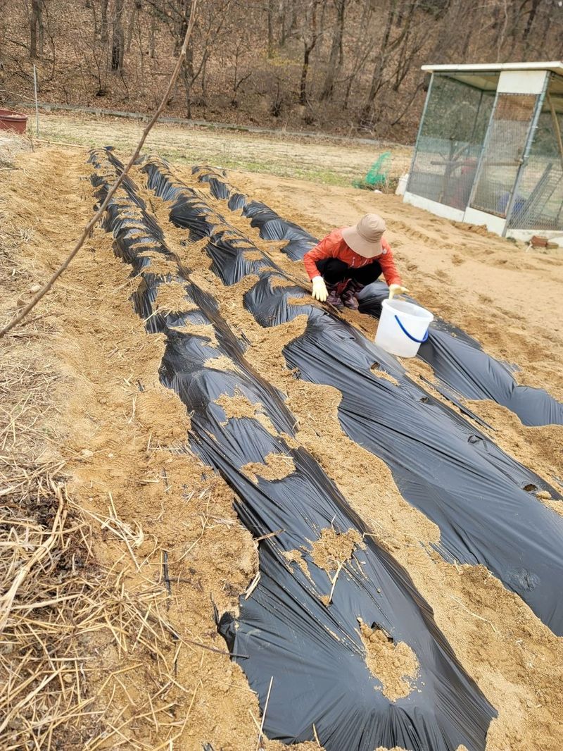 약간의 비료 살포후 두둑은 안만들고 비닐 멀칭하고 들깨 심음