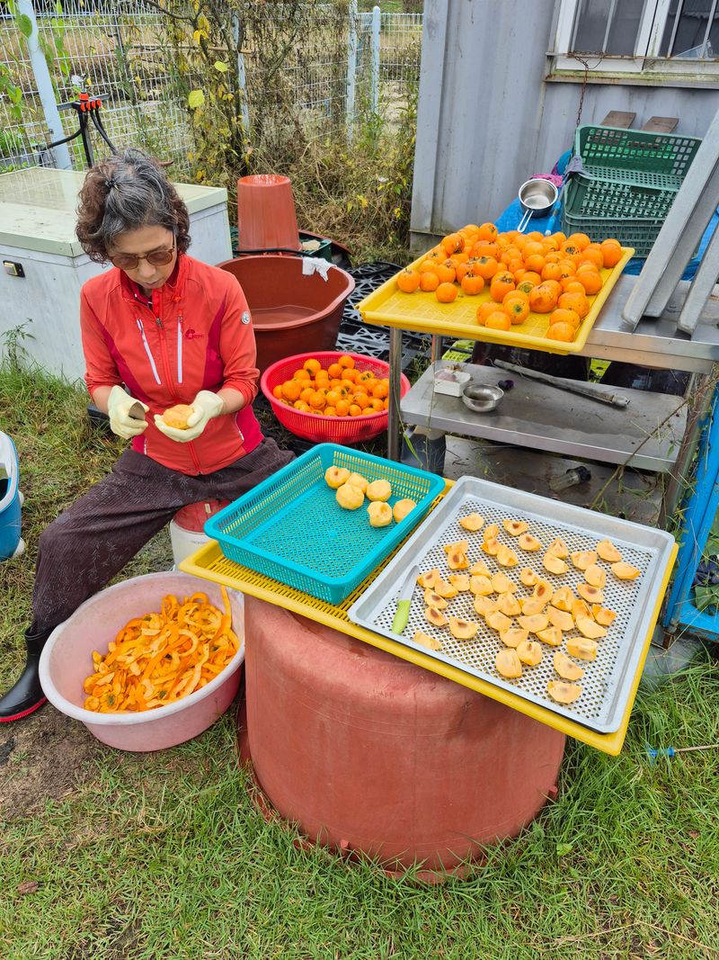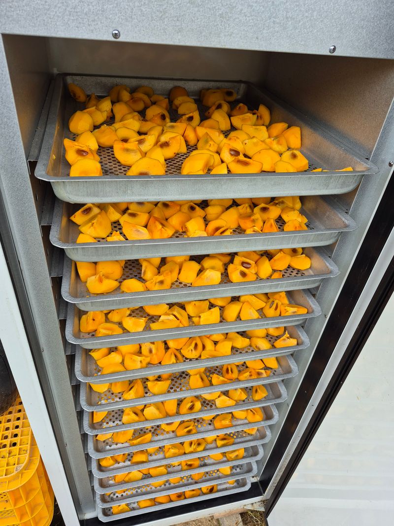 세척후 껍질제거하고 잘게 토막내어 건조기로 건조시작함