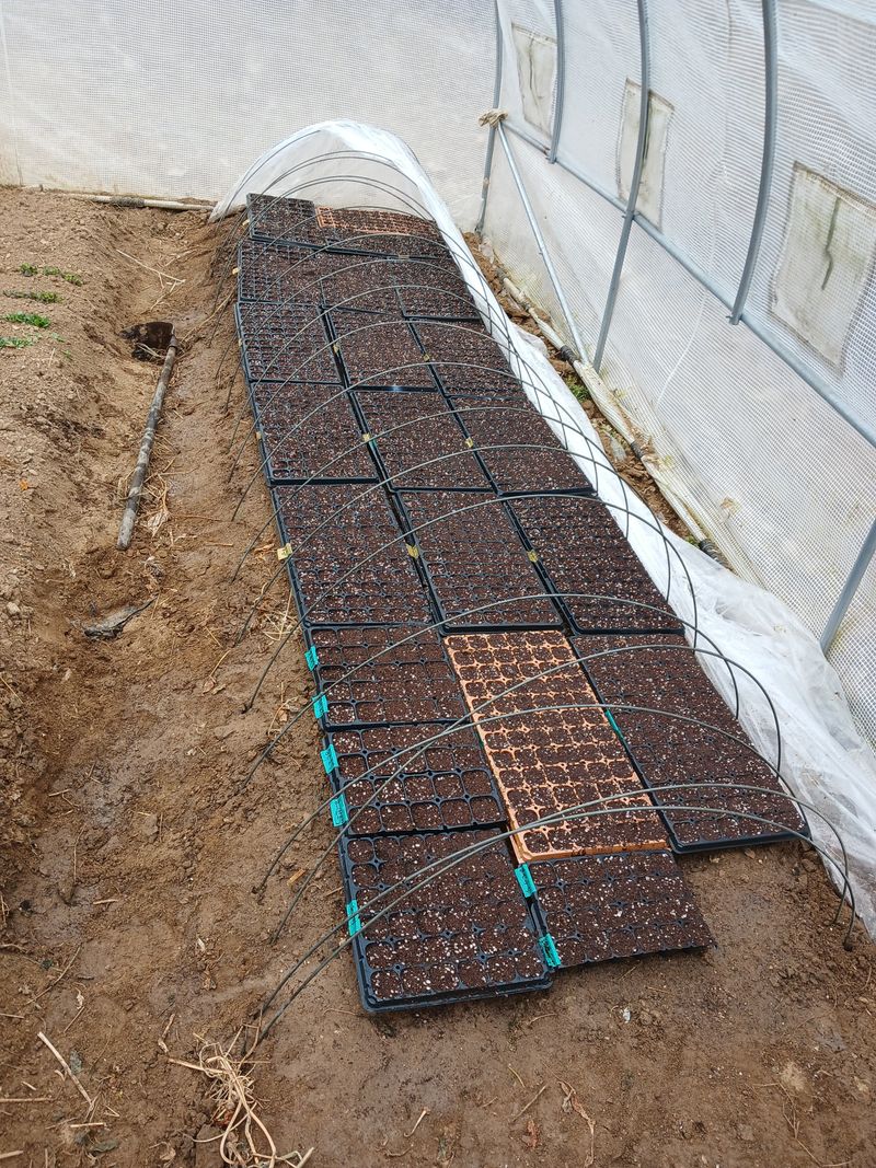 비닐터널식으로 보온한 양파.마늘을 벗김.그린양배추(3.20).방울양배추의 씨앗 모종