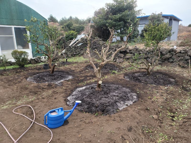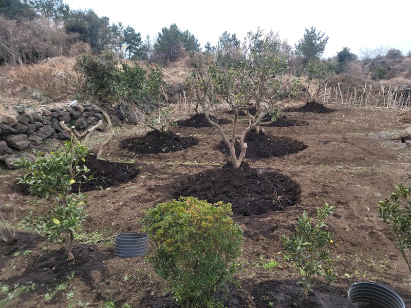 귤 농장포기하는데서 12그루 얻어와서 심었습니다 나무가지치기 뿌리자르기 하고 심고난후 가지치기한데 약 바르고 뿌리부분에는 살충제와 뿌리나는 약을 사용하고 물호스로 뿌리부분에 공간이 생기지 않토록 깊게 물을주고 윗부분까지 충분히 흙을 덮어주고 충분히 물을 주었습니다