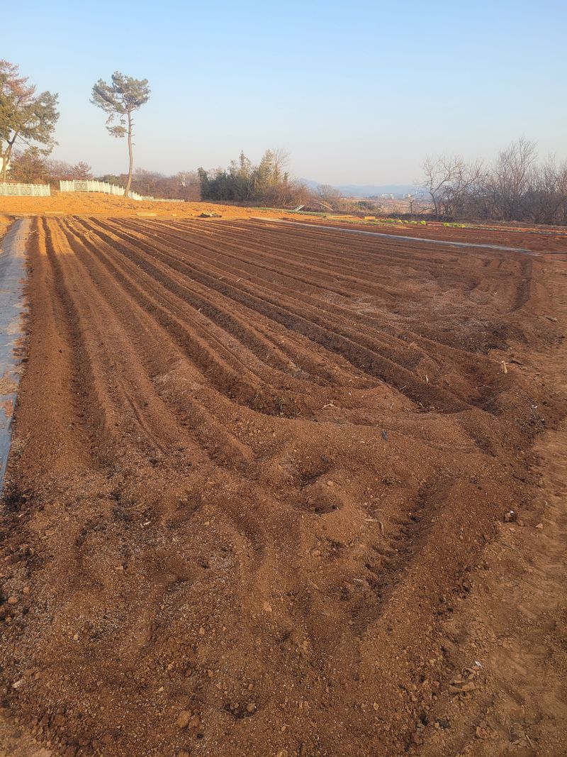 한달전 석회고토 뿌리고 로터리, 오늘 퇴비와 부숙된 왕겨 뽀리고 로터리 했습니다.