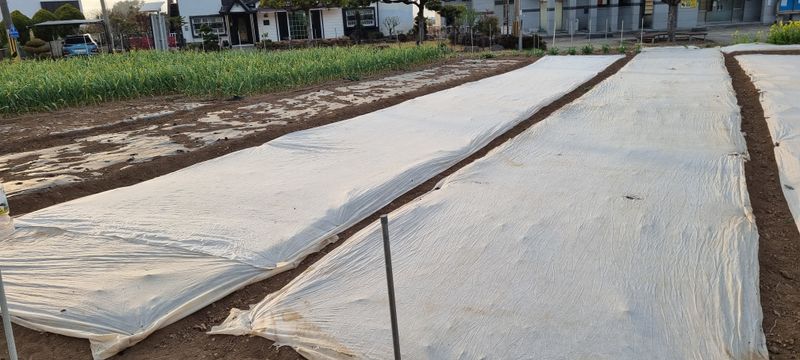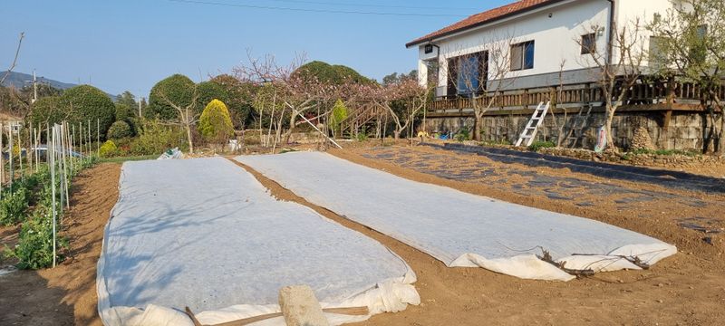 옥수수 두 이랑 파종 물 뿌리고 부직포로 덮다