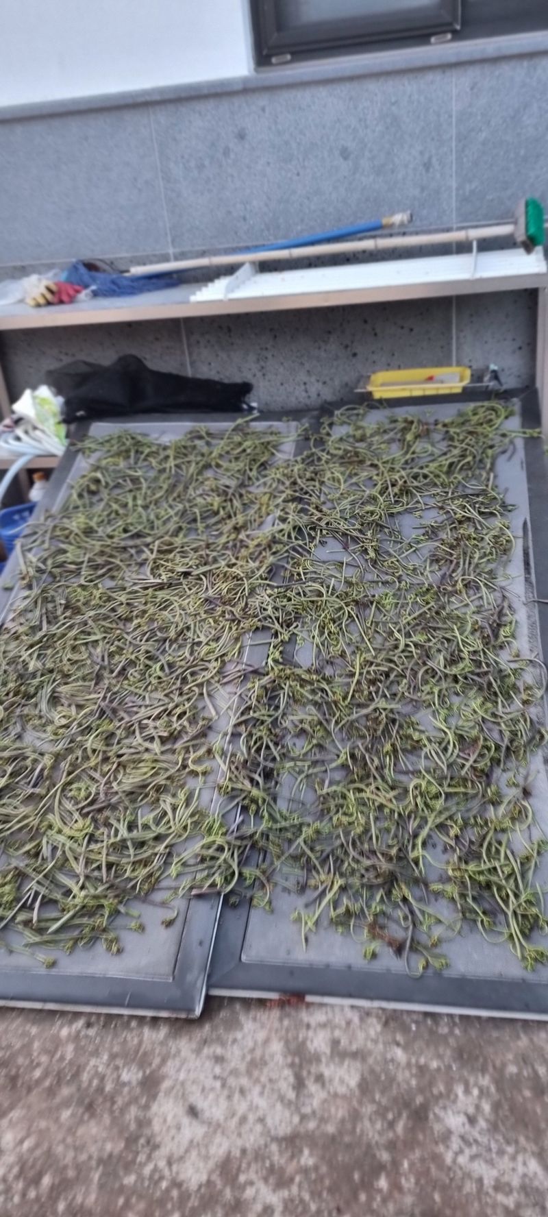 우물 위 고사리 밭 울타리 정비하고 고사리 2차 수확, 8kg쯤 삶아 널다