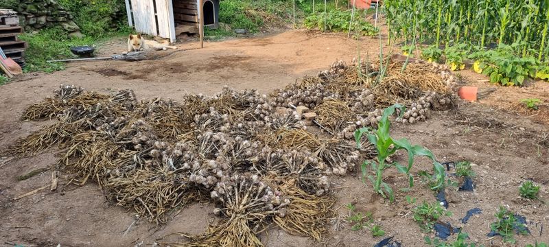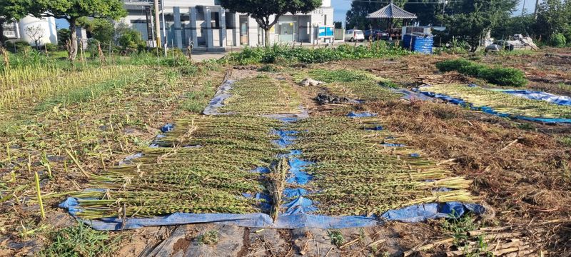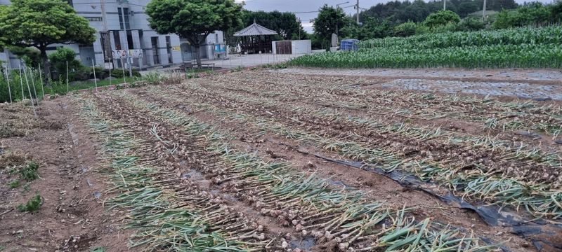 수확 마늘 묶어 걷어내기 참깨 싹이 났다