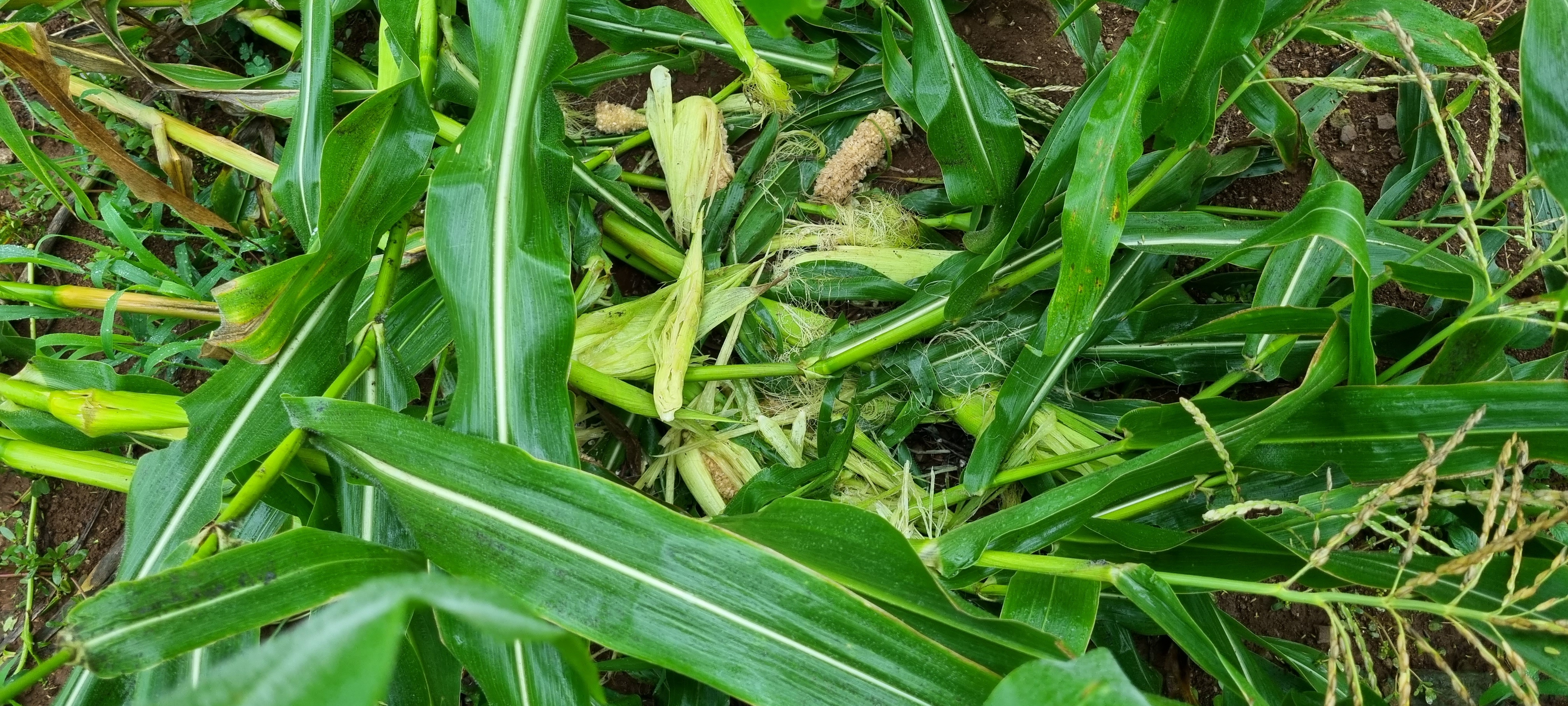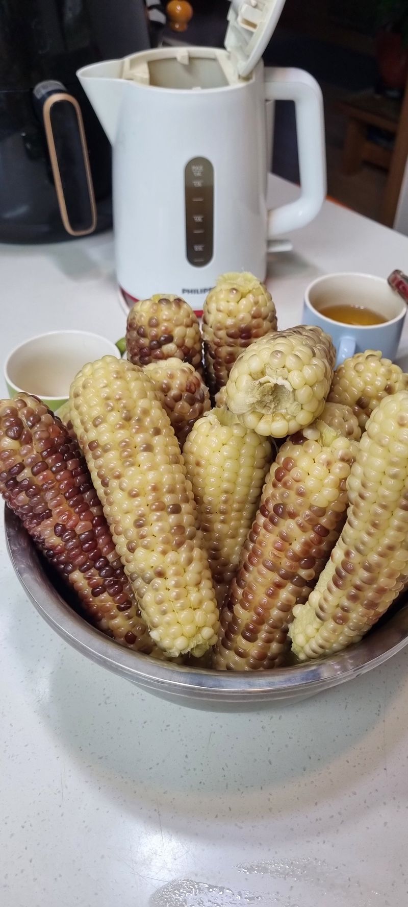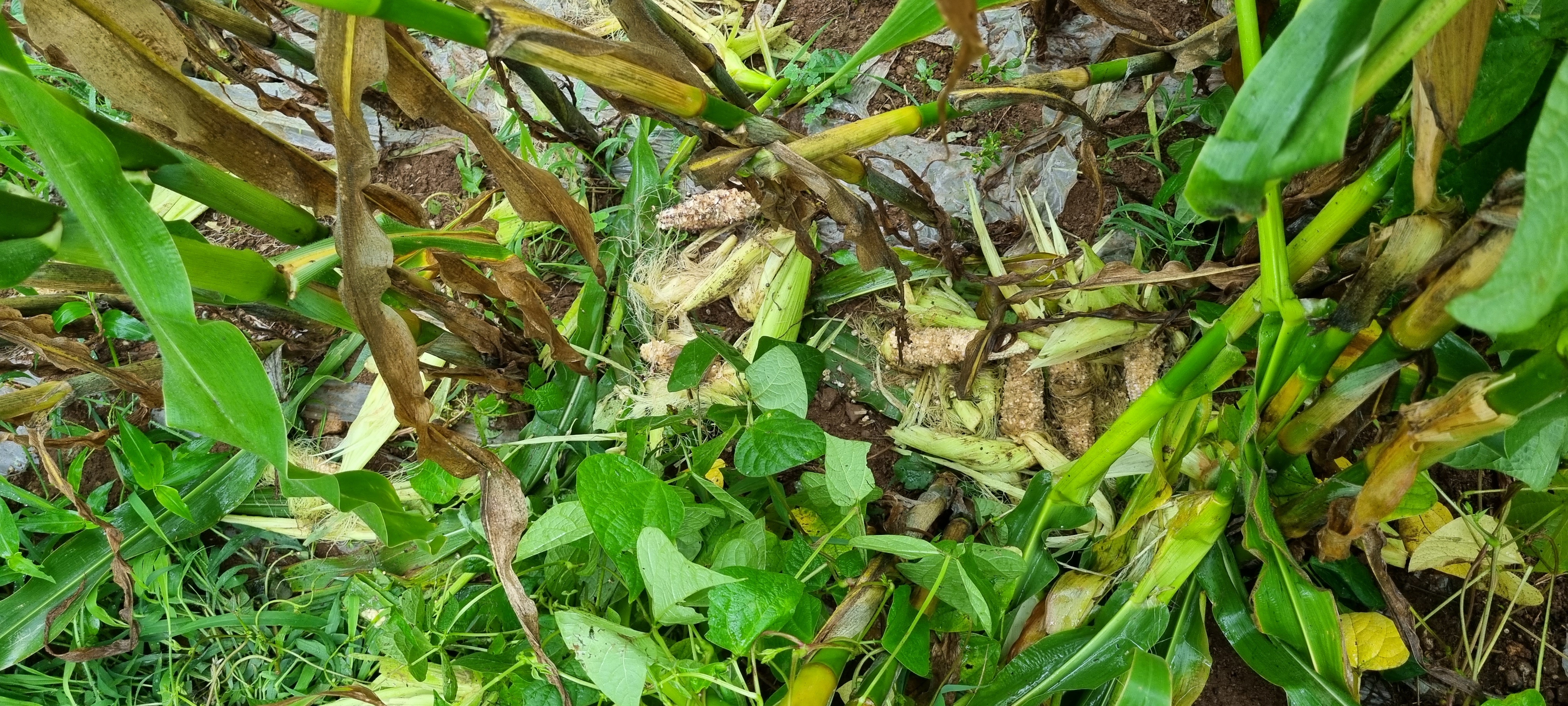 오늘 아침 서리태 콩대 베다 사이에 심은 옥수수 따 먹으멧돼지가 밟아 수확이 부실하다