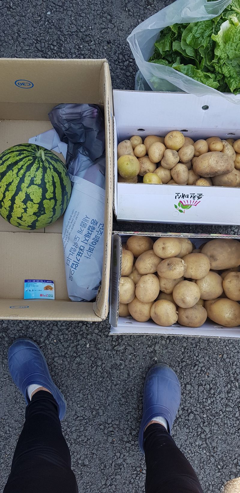 감자캐러갔는데ㄴᆢ무더워서 땀으로 목욕하고~ㅠ 수박도익은거같아서 수확.상추.고추.토마토등 수확. .