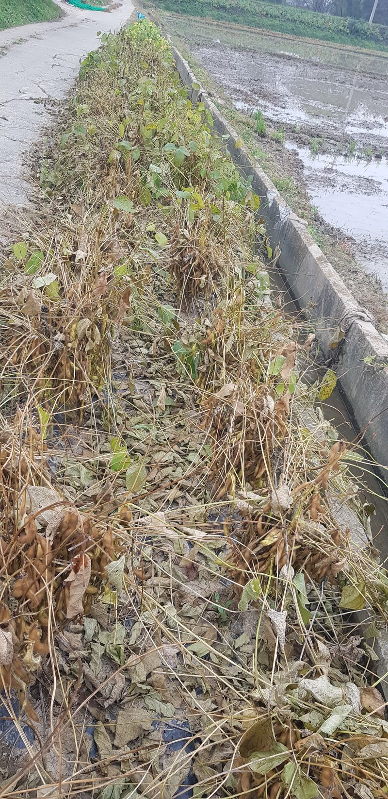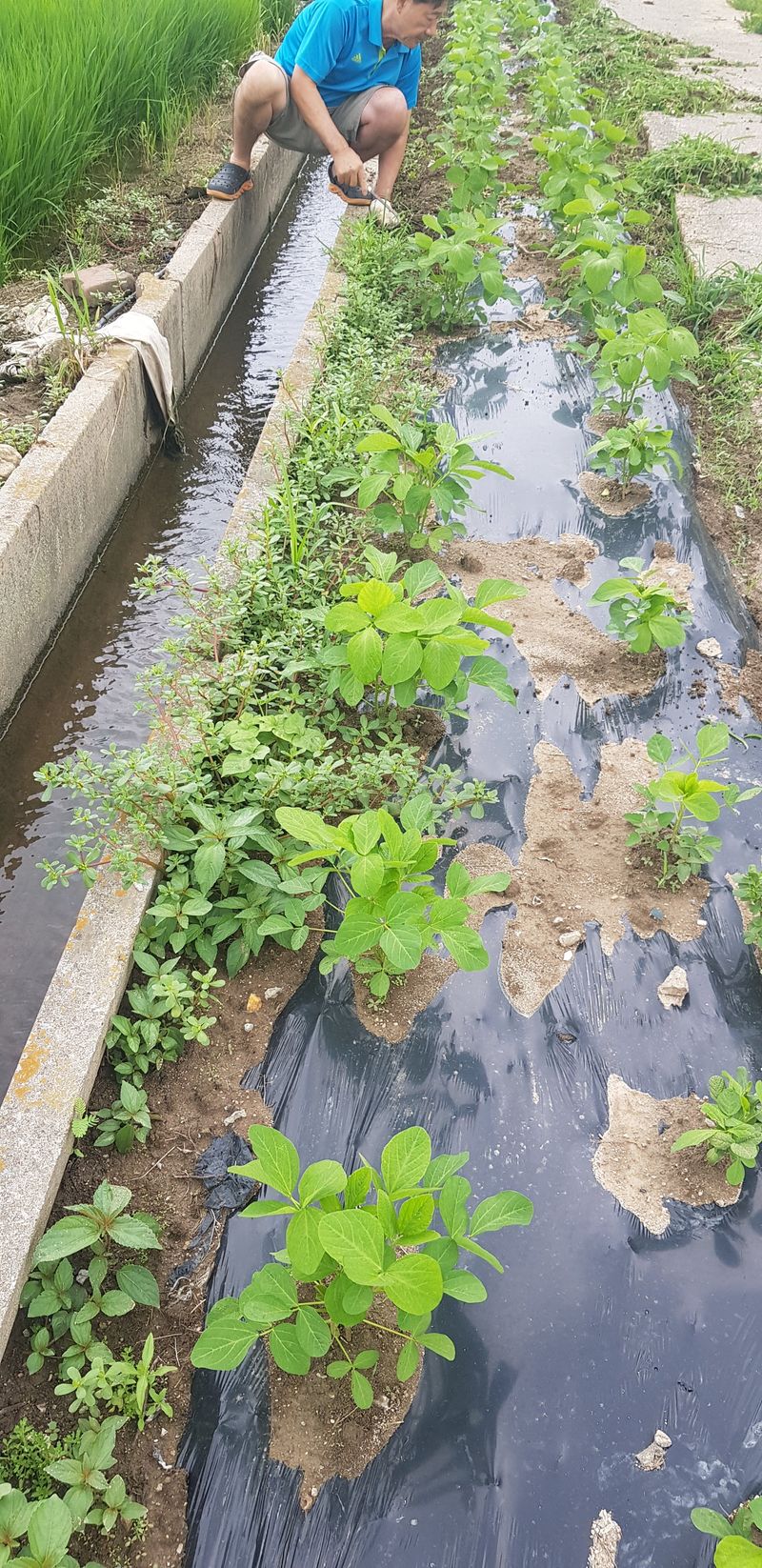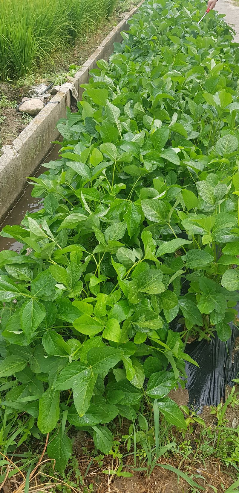논물을 자작하게가두어두고 조금씩. 마르지않게. 조금씩들어가게 해주었다.논둑에 콩도아직은어리지만많이 자라서 콩다운모습을하고있다