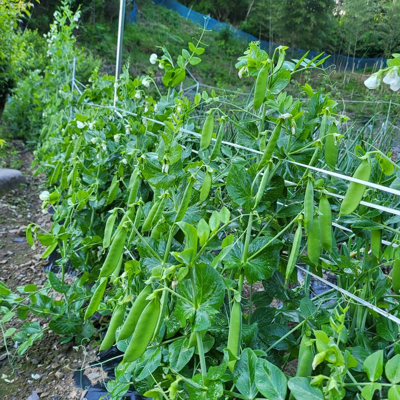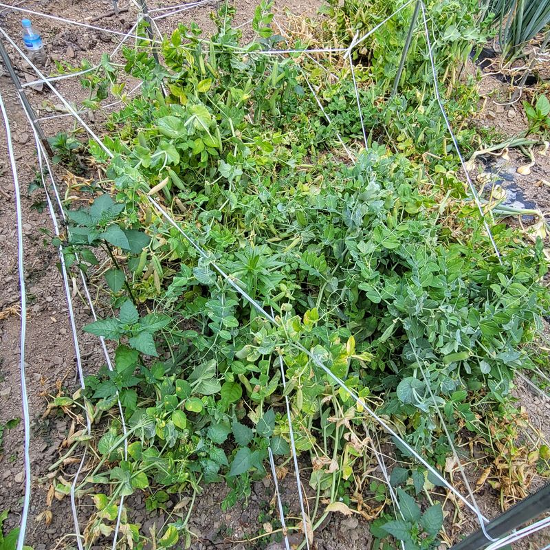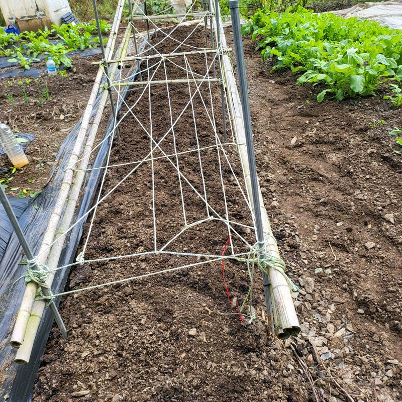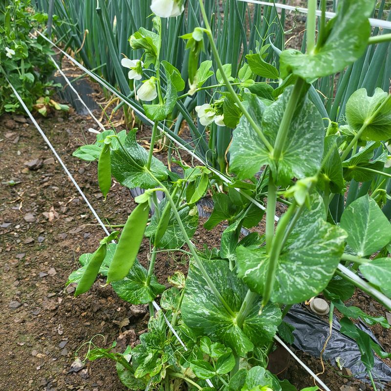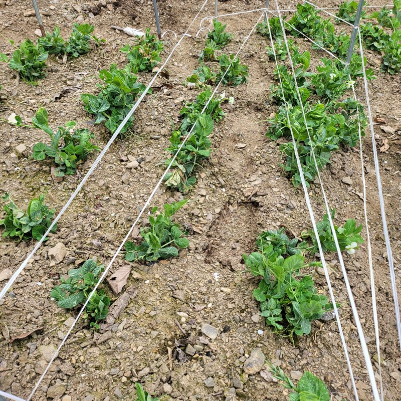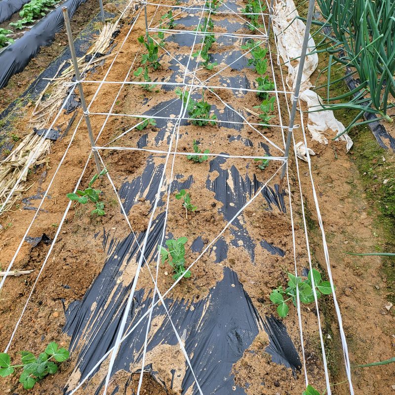 <완두콩 지주대와 줄치기> ○가을에 심은 완두콩은 벌써 콩 꼬투리가 달렸다. ○올봄에 파종한 완두콩 지주대 세우고 줄치기