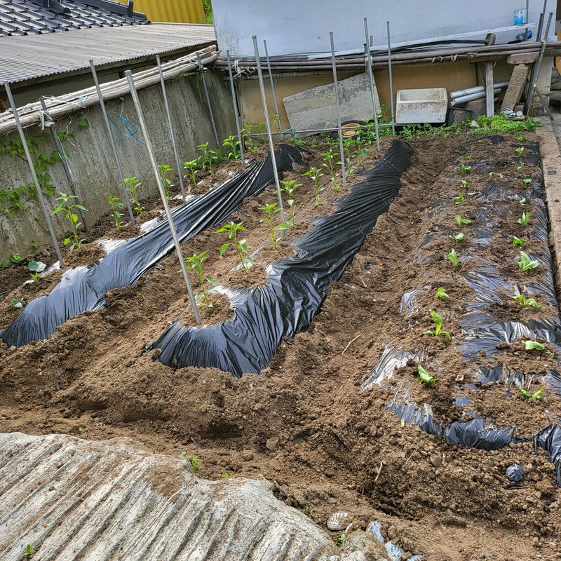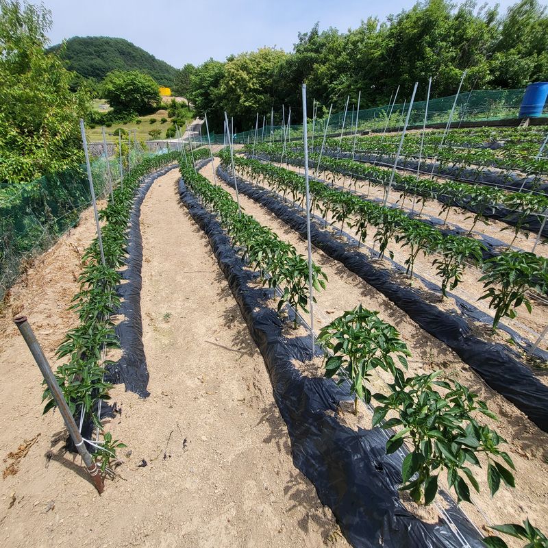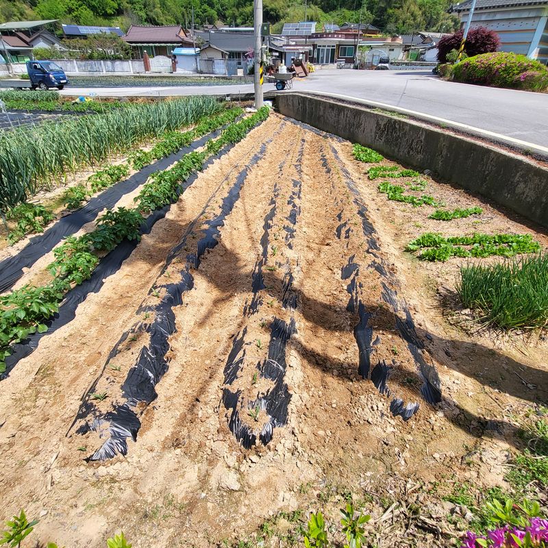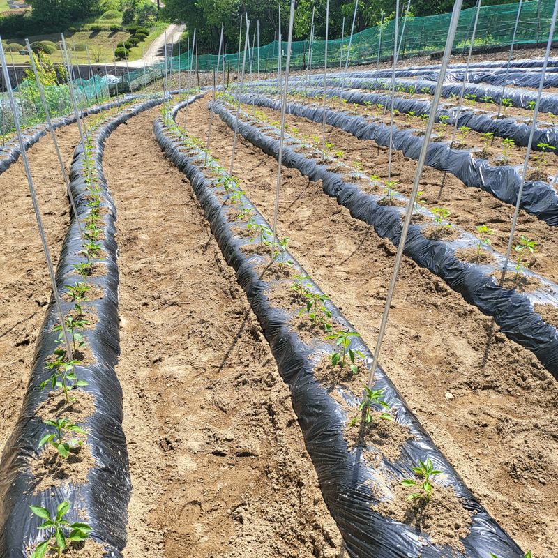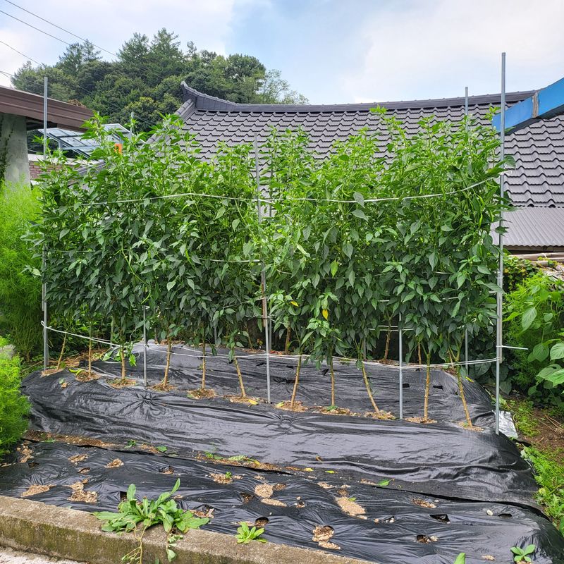<마당 텃밭에 비타민고추 파종> 매년 심어 온 가족이 잘 따먹고 있는 비타민고추 모종 21포기를 구매하여 퇴비,복합비료, 토양 살충제,커피가루 뿌리고 파서 비닐멀칭후 파종 지주대까지 꽂기 완료 토 한줄에는 양상추 25포기 심기