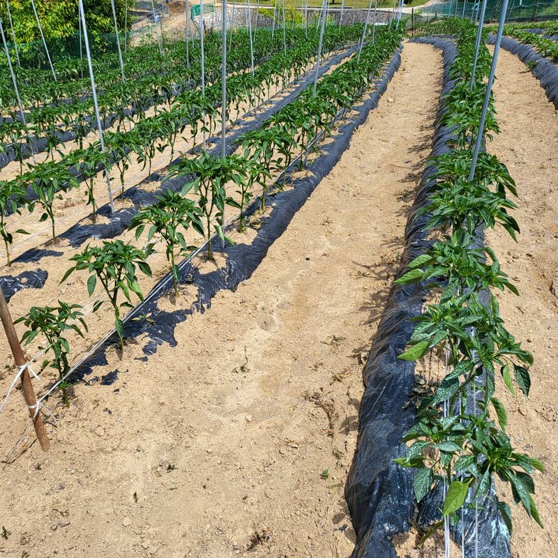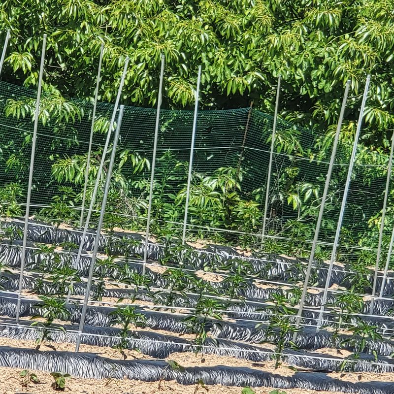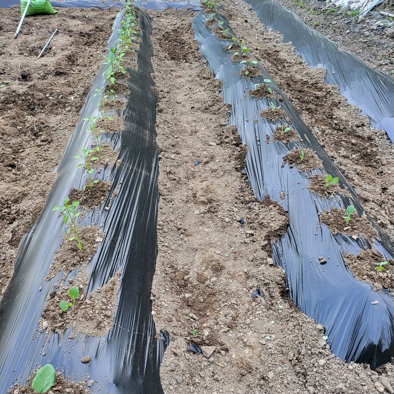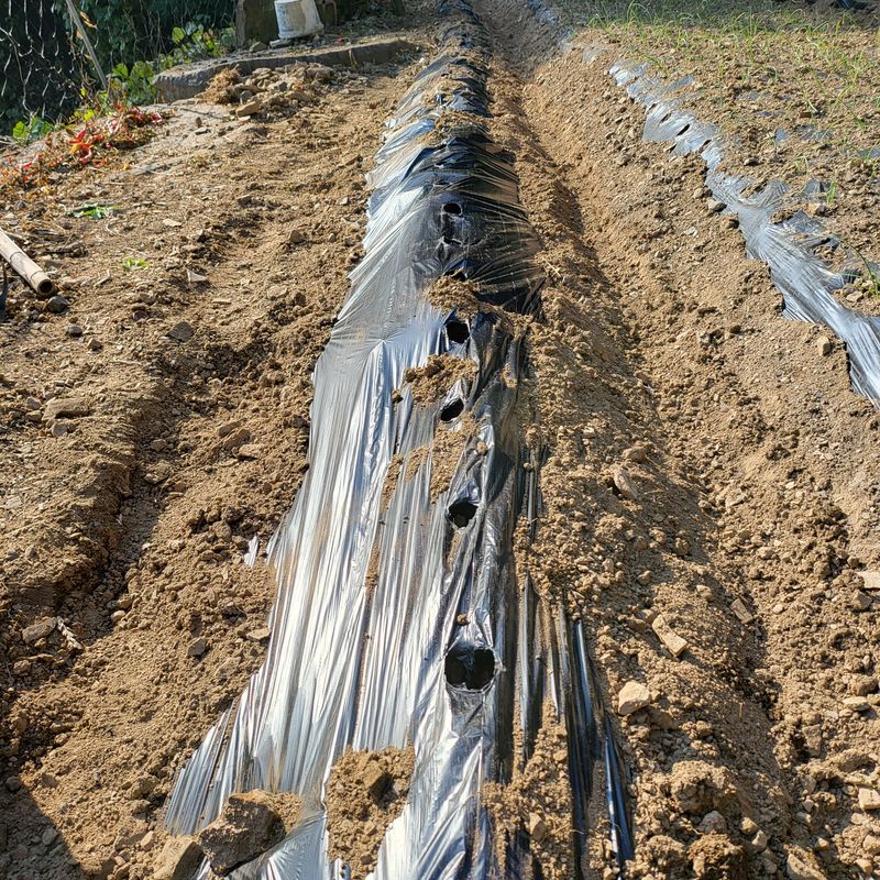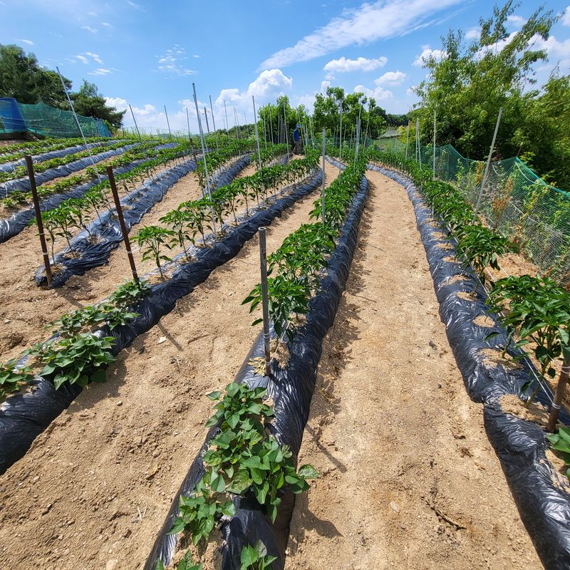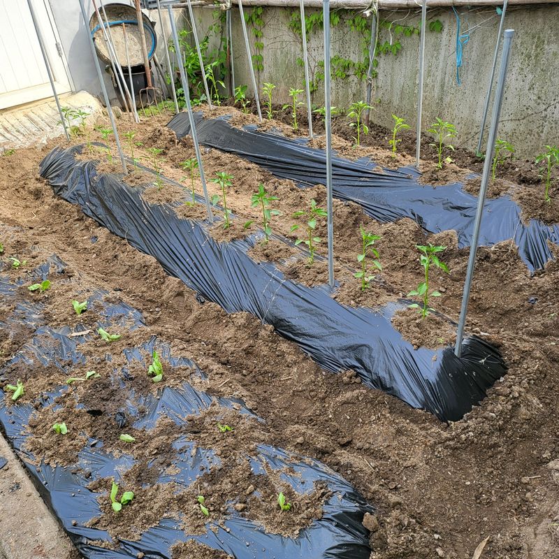 <마당 텃밭에 비타민고추 파종> 매년 심어 온 가족이 잘 따먹고 있는 비타민고추 모종 21포기를 구매하여 퇴비,복합비료, 토양 살충제,커피가루 뿌리고 파서 비닐멀칭후 파종 지주대까지 꽂기 완료 토 한줄에는 양상추 25포기 심기