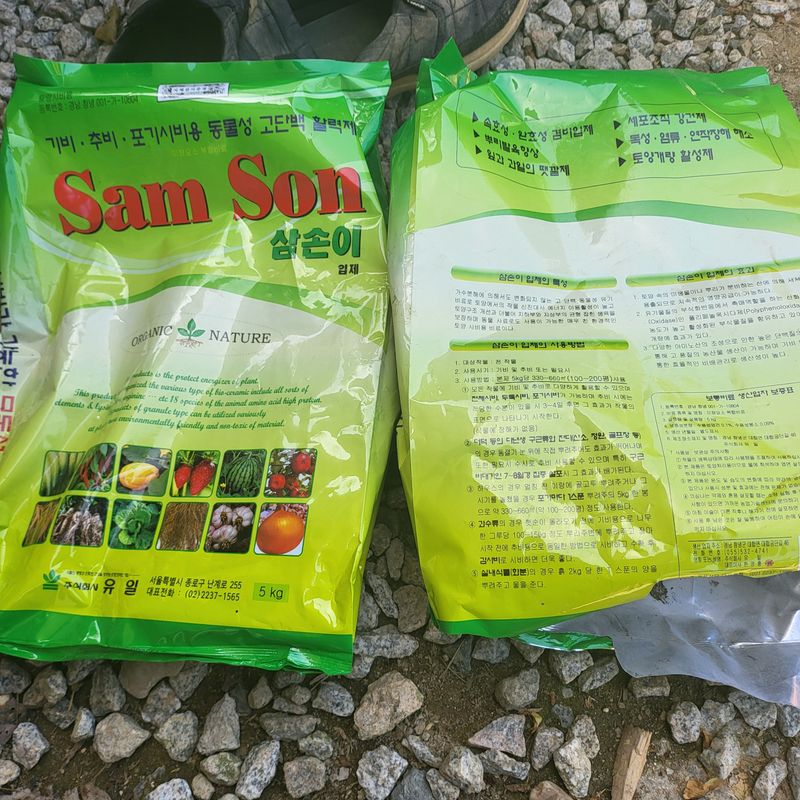 <홍고추 2차 추비> ○고추가 전반적으로 질소가 부족한듯 하여 고단백 활력제 삼손이 입제 2차 추비 1차 추비는 요소비료 주기