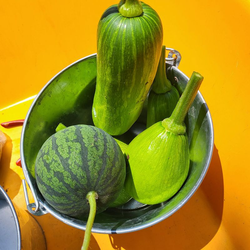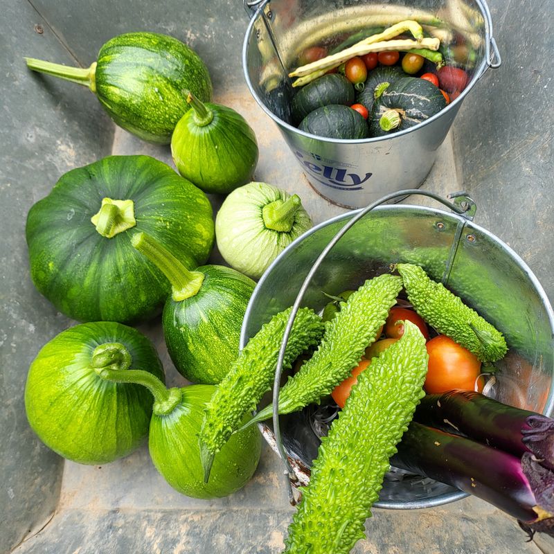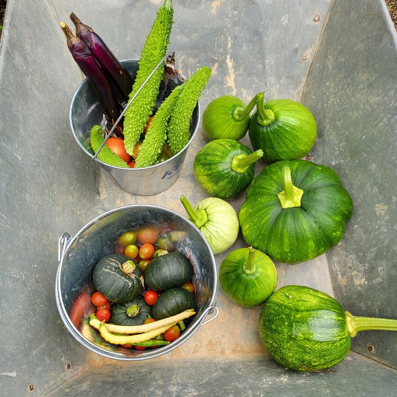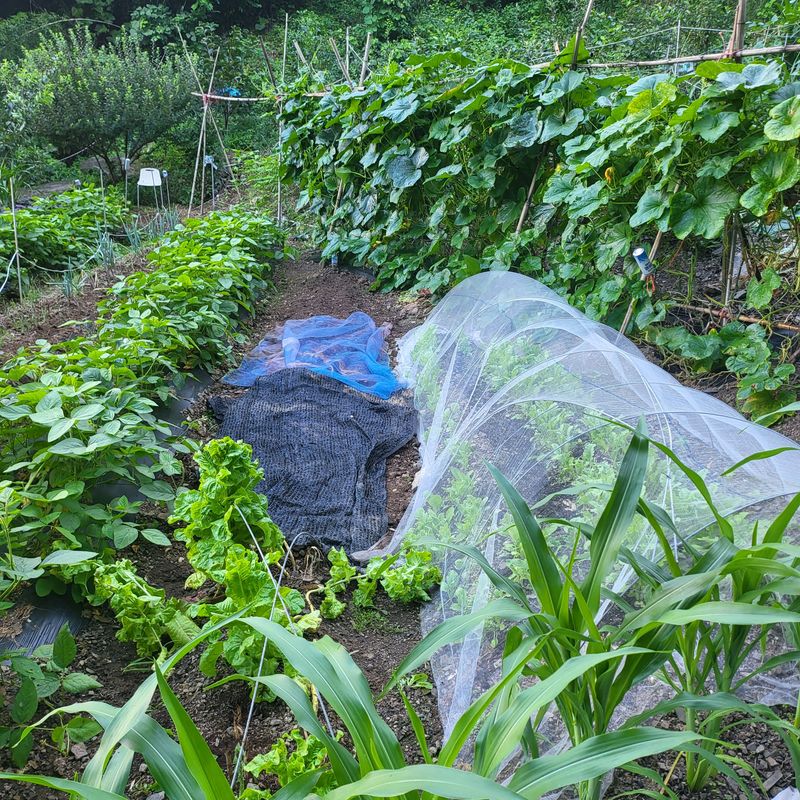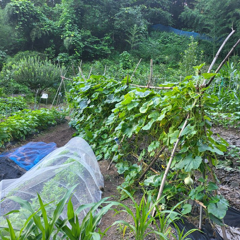 <쪽파 종구 심기> ○봄에 수확하여 잘 보관해온 쪽파 종구 뿌리와 위를 자르고, ○아욱, 쑥갓, 상추 뽑아내고, 쪽파 심기, 쫄대 꽃아 한랭사 덮기 ○미니단호박 4, 호박 7, 여주 4, 가지 2, 토마토, 동부콩 등