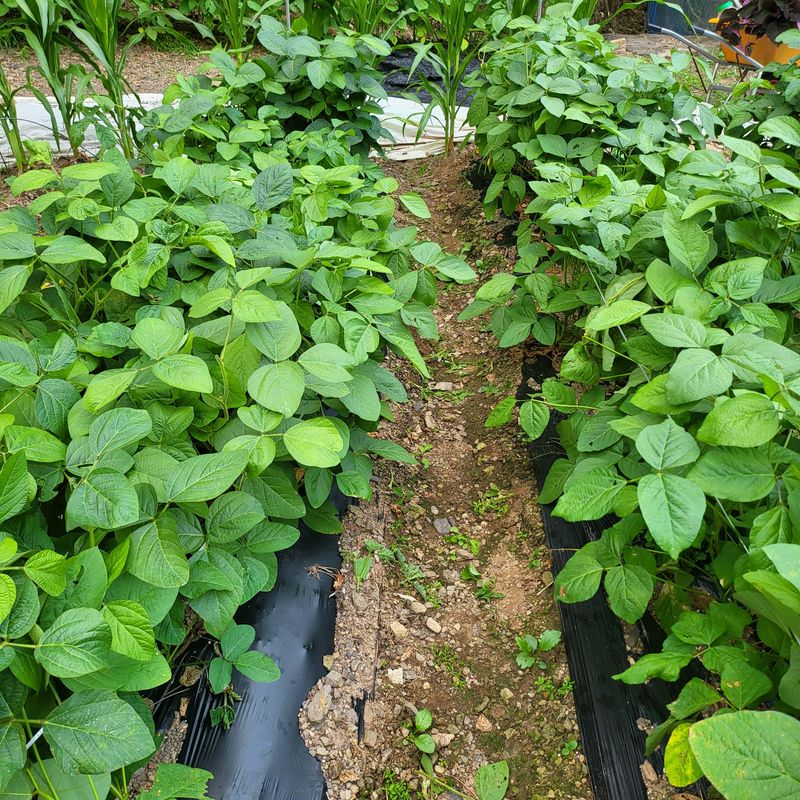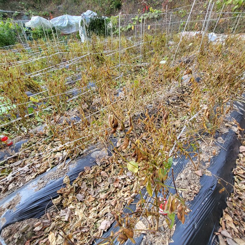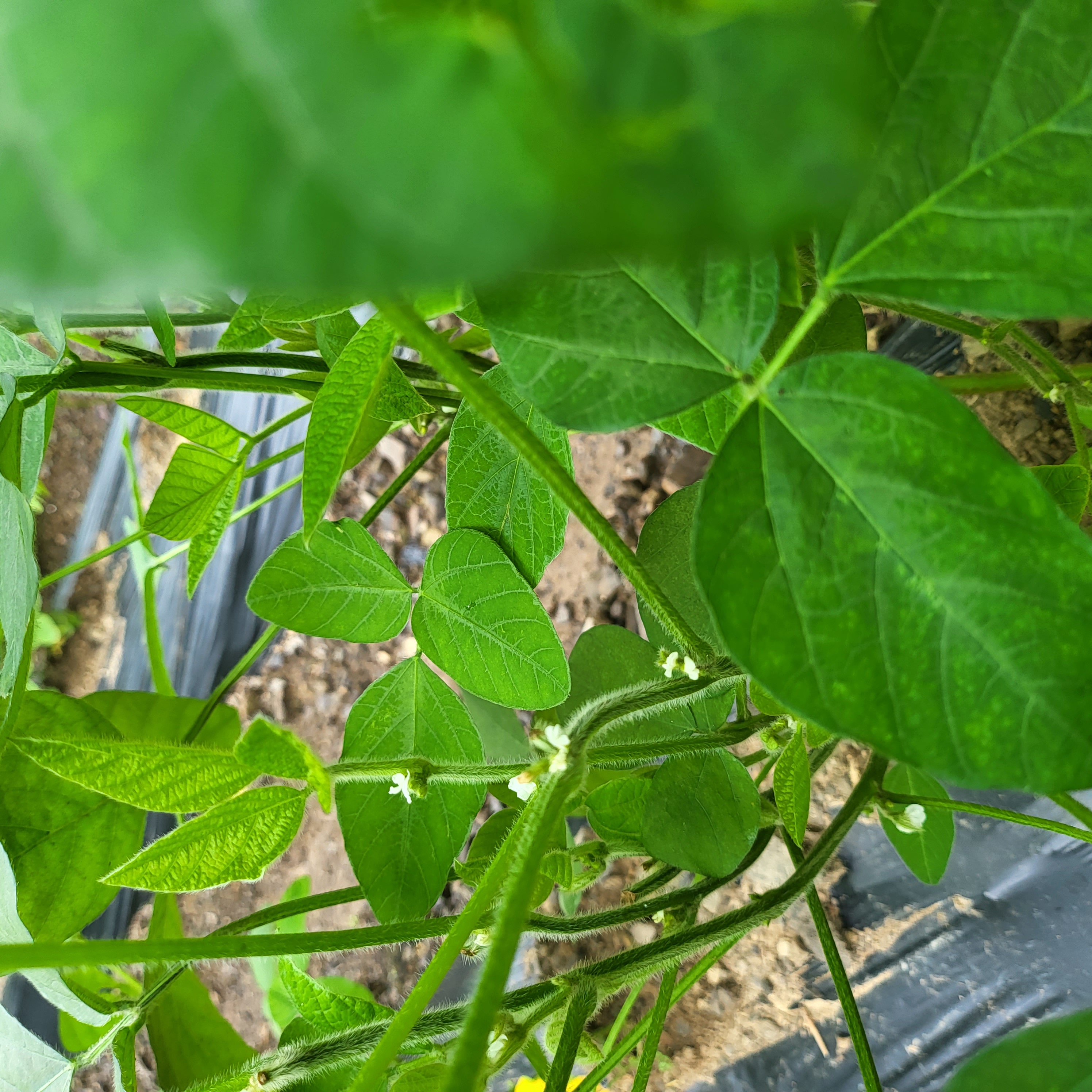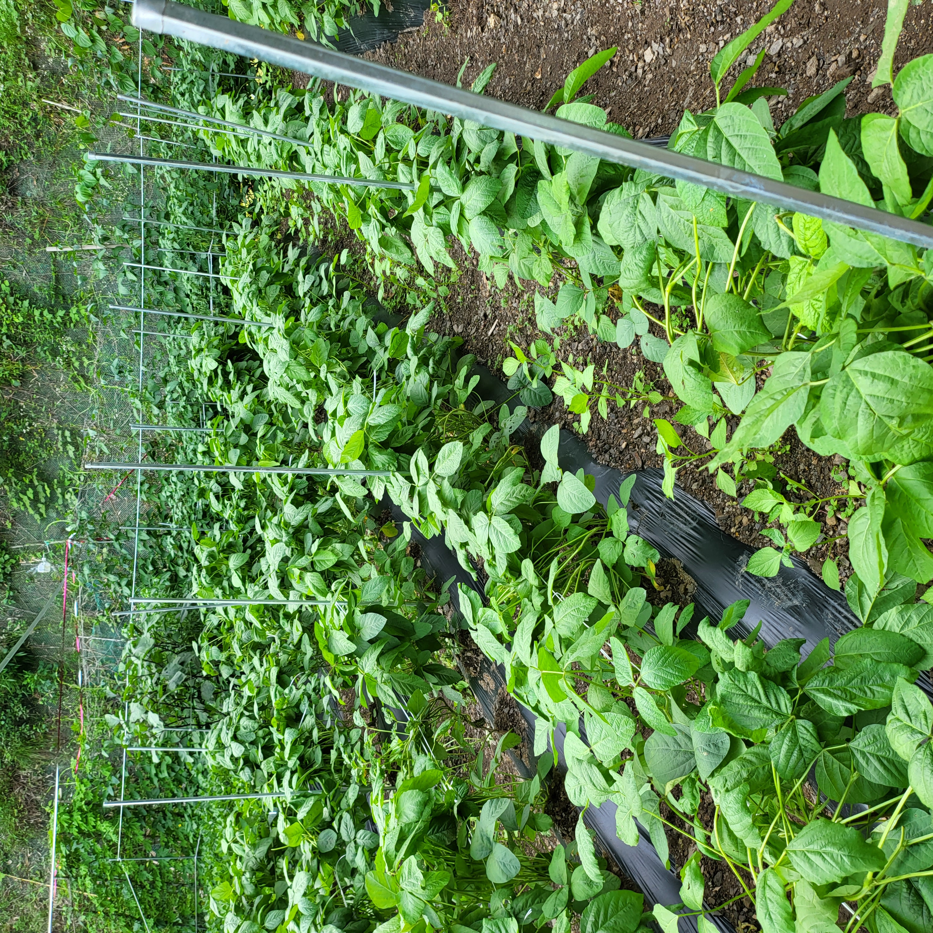 메주콩과 서리태 가지가 많이 뻣어나오도록 머리순을 잘라 주었다. 이미 쓰러진 서리태에 지주를 세우고 줄을 쳤다. 앞으로 쓰러짐방지를 위해 중간중간 끈을 묶어 고정시켜 주었다. 메주콩은 벌써 꽃을 맺었다.