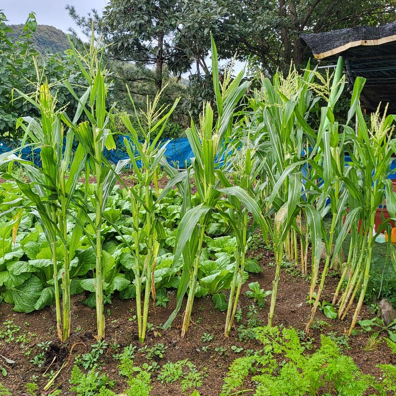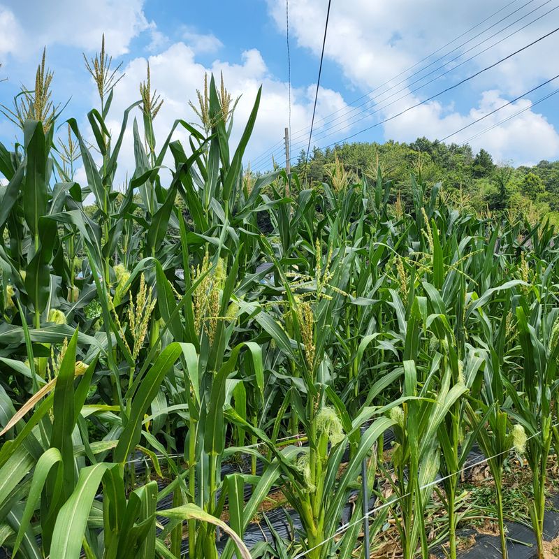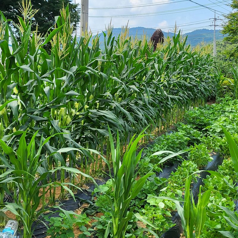 7.6 옥수수 순 바람이 잘 통하도록 따주니, 동네사람들이 오가며 참 시원하게 잘 솎아 주었다고들 한다. 7.12오늘 옥수수 상태 확인후 1차 130개 수확 첫 농사치고 성공적으로 아주 잘 여물었다. 10월에 수확 목표로 포트에 1판(사진)옥수수 씨앗 심어 싹이 돋아나...