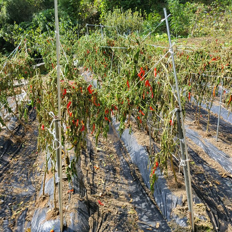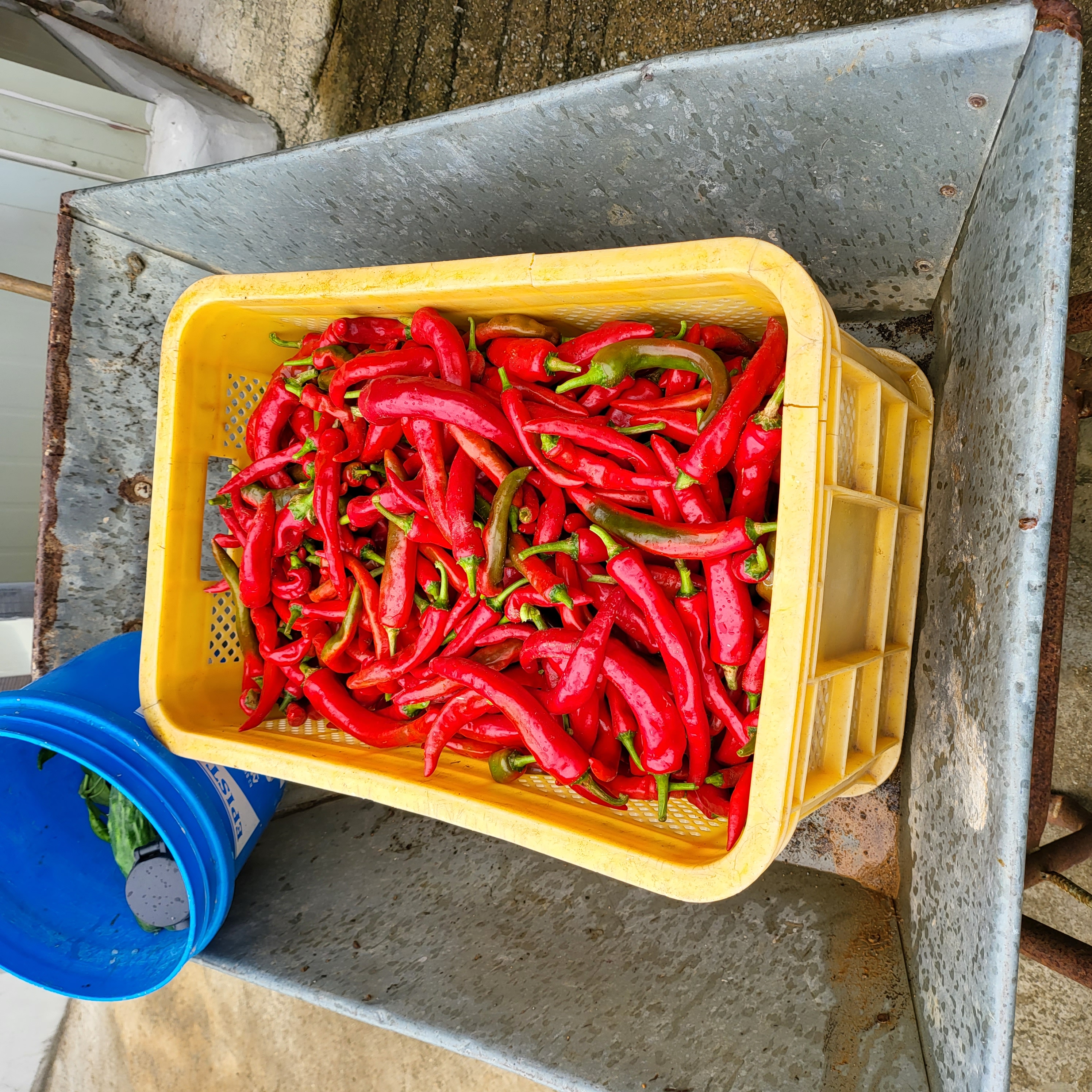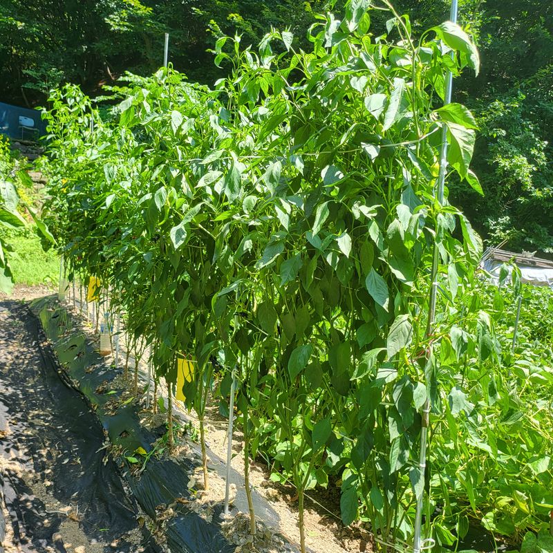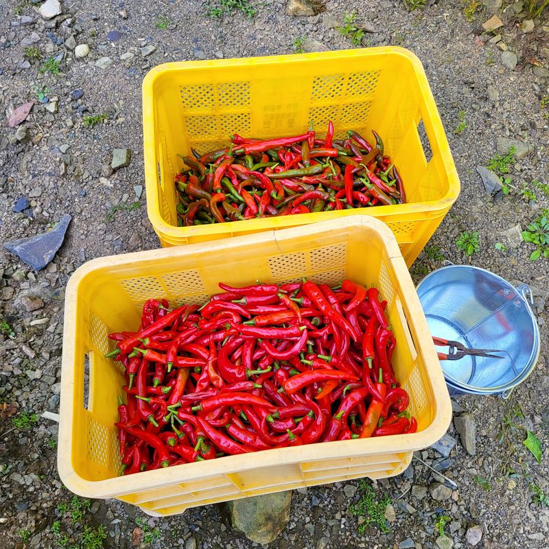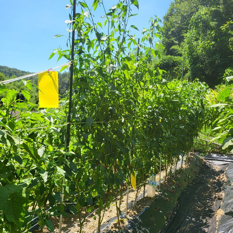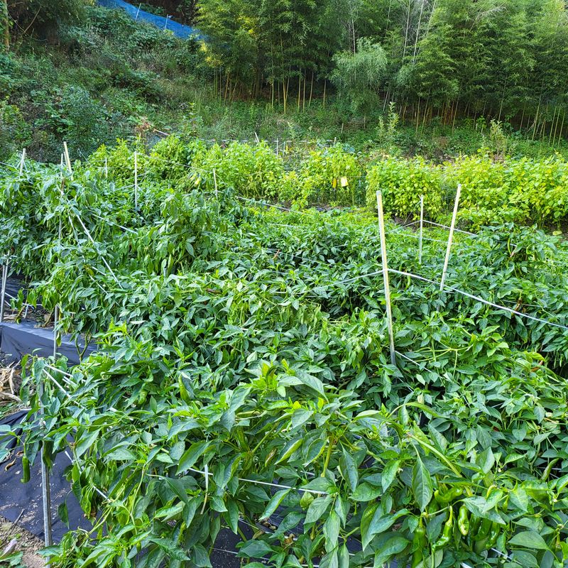 <홍고추 4차 수확> 🌶 홍고추 새벽 일찍 4차 수확하고, 유인줄치기 텃밭에 심은 고추는 너무 웃자라 고추는 열리지 않고 키가 내키를 넘어섰다. 아마도 주변이 산속이고 주변에 큰나무가 많은 탓인듯 하다.