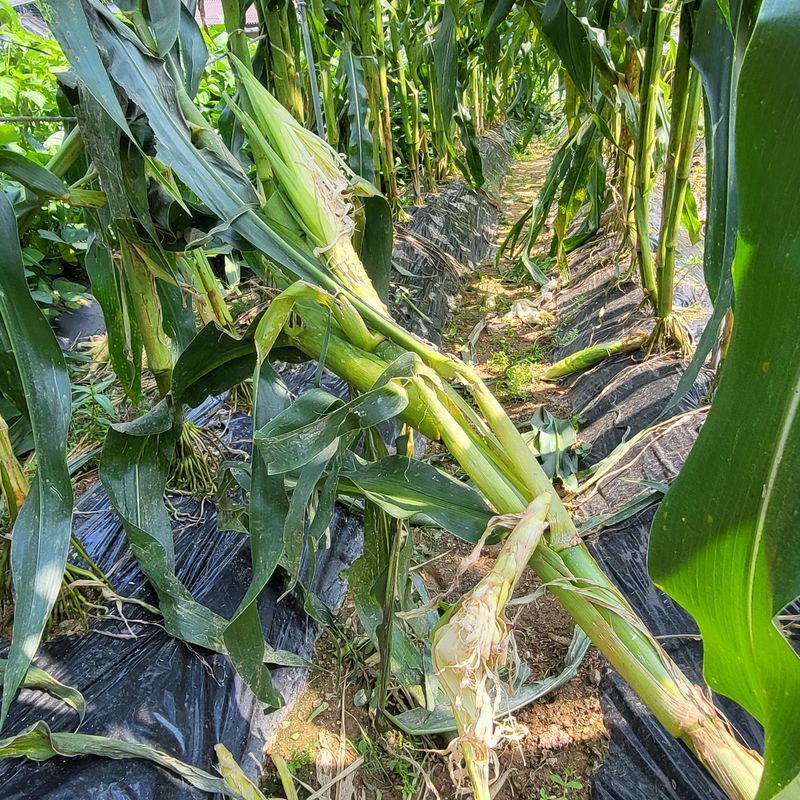 어제 오늘 비바람과 돌풍으로 쓰러진 옥수수 지주설치하고 세워 줄치고 한주한주 쓰러짐방지를 위해 묶어주기 호박,넝쿨강낭콩, 조롱박, 여주, 작두콩 등 강한 비바람에 대나무를 세워 만들은 유인목이 소실되어 묶어주기