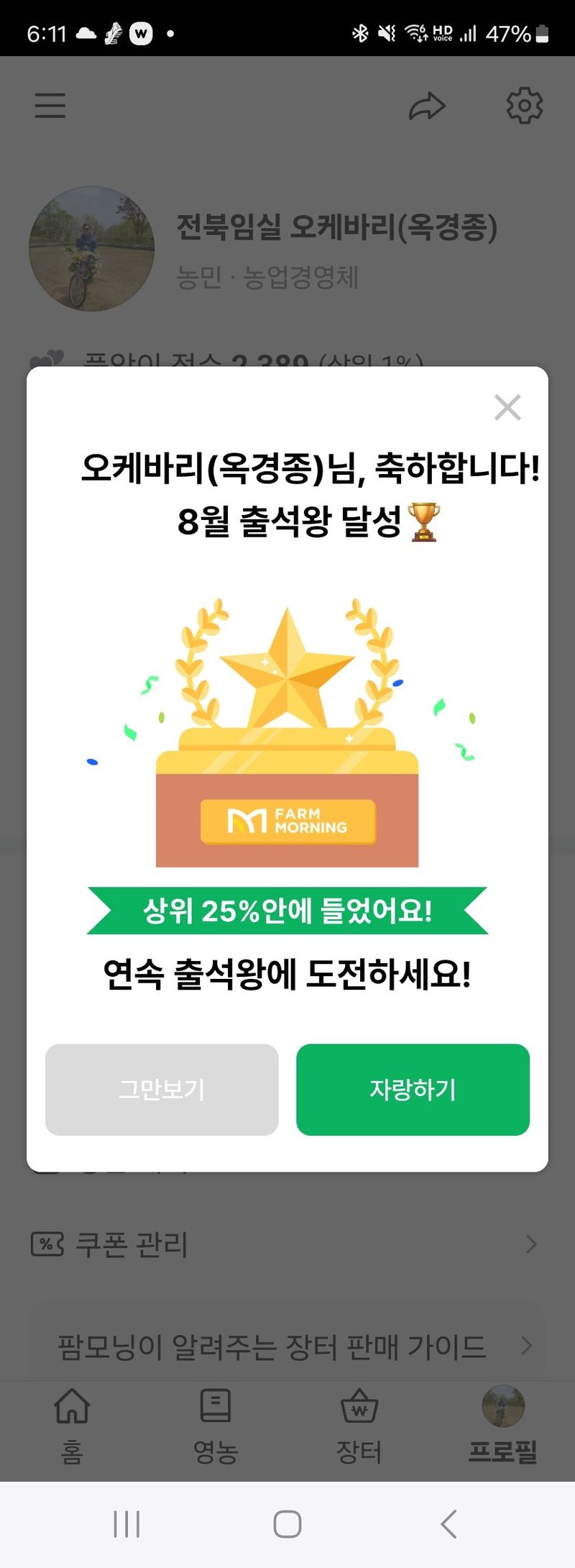 그동안 노모가 평생을 농사일, 직장생활로 오가며 도와드렸는데, 이제 퇴직과 함께 주말텃밭을 가꾸며, 팜모닝에 관심을 갖게 되었다. 과거엔 잠업도 하였지만 현재는 고추,고구마,콩,들깨,참깨,감자,배추,무우,상추,토란,호박,오이,옥수수,마늘등 농사짓는 재미에 푹 빠졌다.