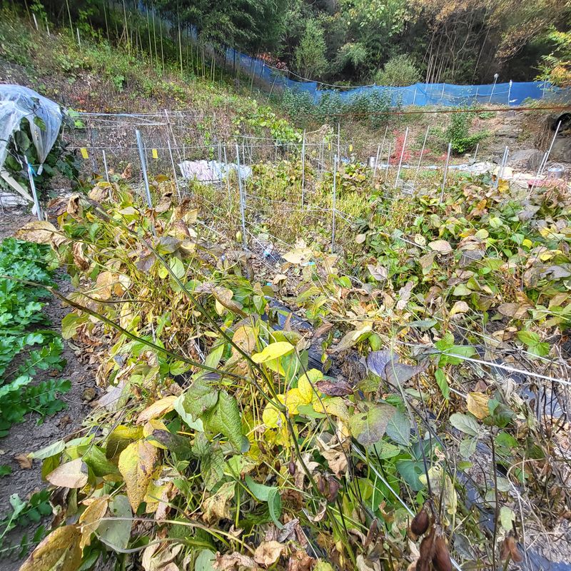 서리태 잎 따주기 콩잎이 노릇노릇 곱게 물들어 가고 있다. 밭가를 제외한 안쪽으로는 많이 안 열렸다. 그 원인이 1)세번이나 순자르기를 해서 일까? 2)간격을 너무 좁게 띄어 심어서일까? 내일은 올들어 가장 낮은 영상 2.6°까지 기온이 내려가 첫서리가 내릴 전...