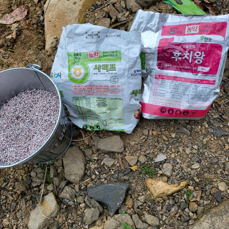 과실나무 유박주기 1.5푸대 매실2주, 앵두1주, 자두2주, 대추1주,체리1주, 감나무9주(대봉,단감,둥시), 살구1주, 사과5주, 블르베리 4주, 아사베리4주,보리수1주, 오가피1주, 얼음1주