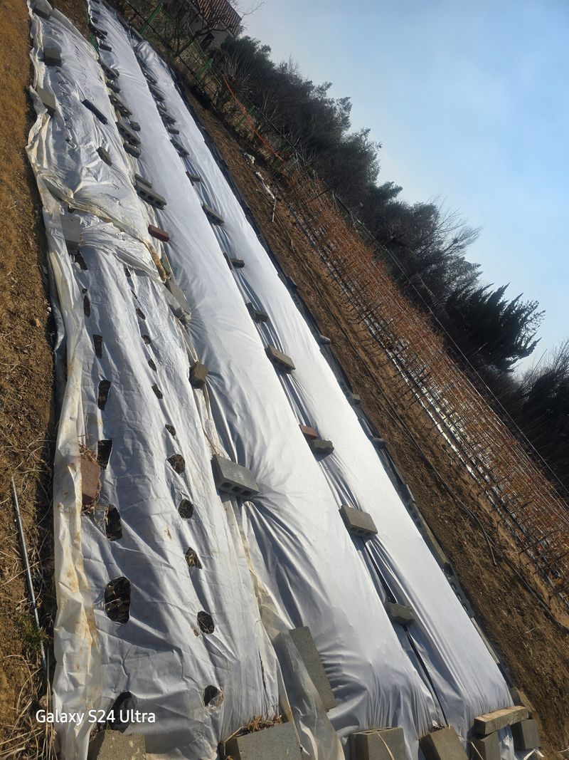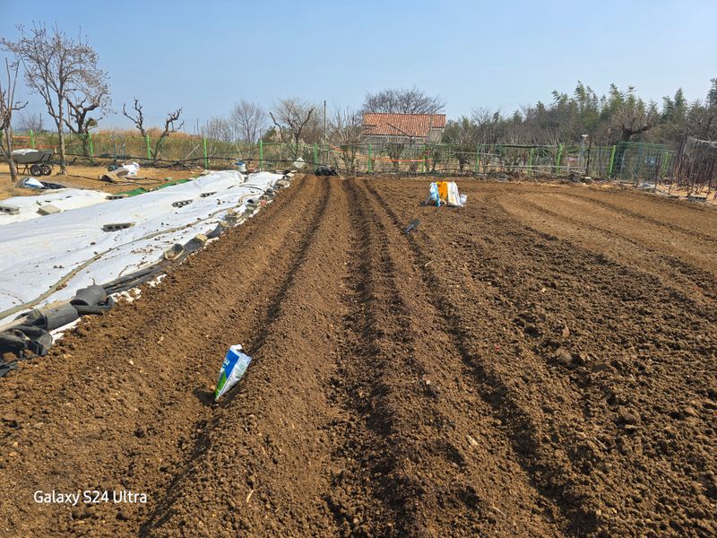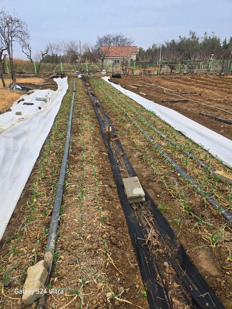 감나무, 산딸기, 장미 등에 대한 황 약 살포를 완료하였습니다. 비닐 멀칭을 하지 않은 마늘밭의 잡초 제거 작업 및 NK 2차 추비 후 부직포를 다시 덮었습니다.
