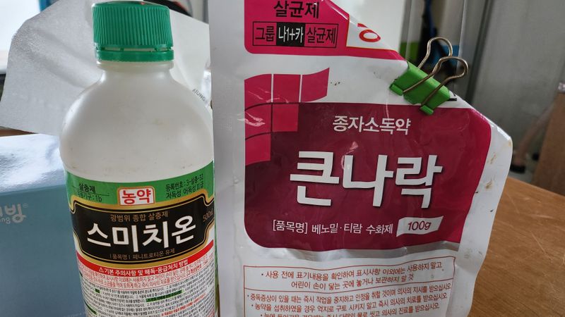 ■마늘, 양파, 복숭아 일부 방제 * 스미지온+염수 살포