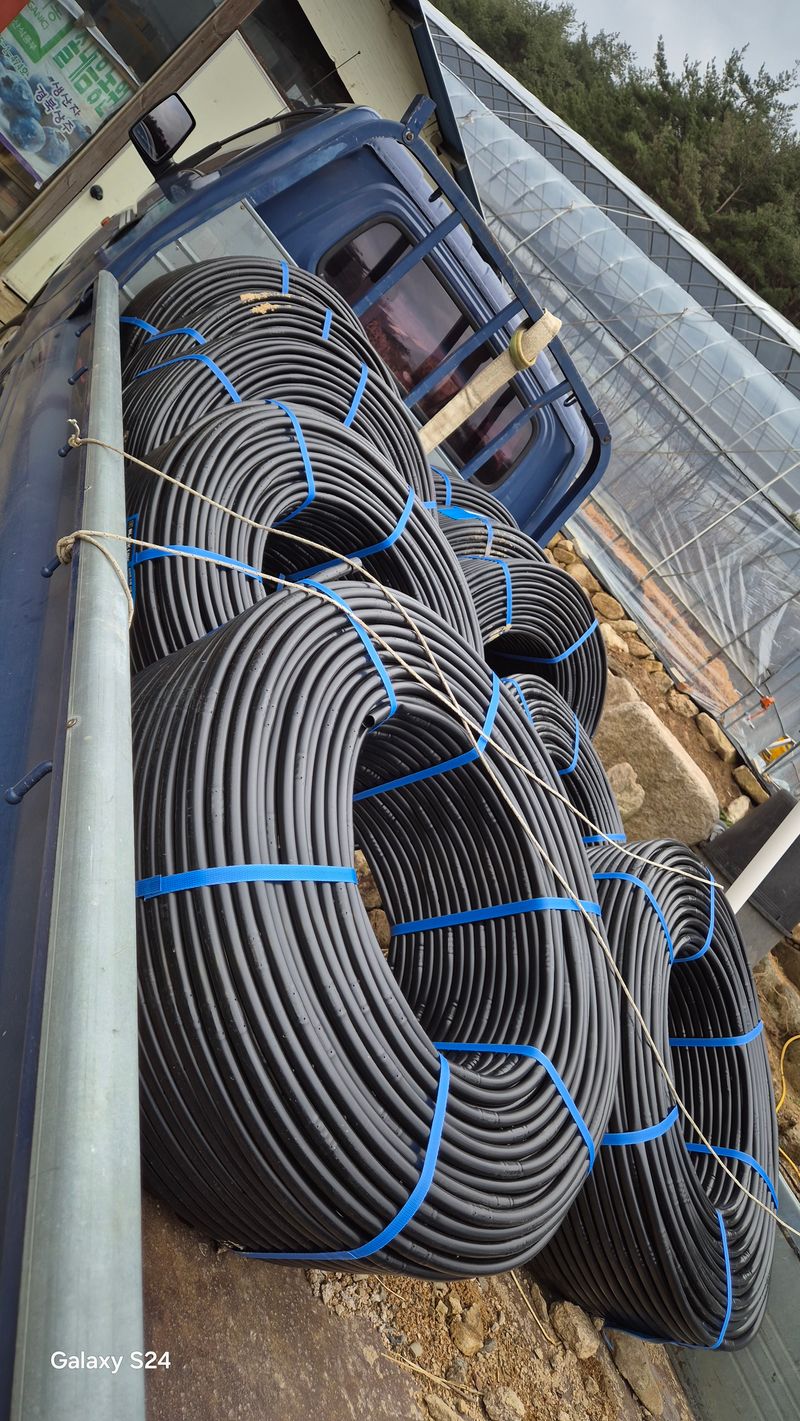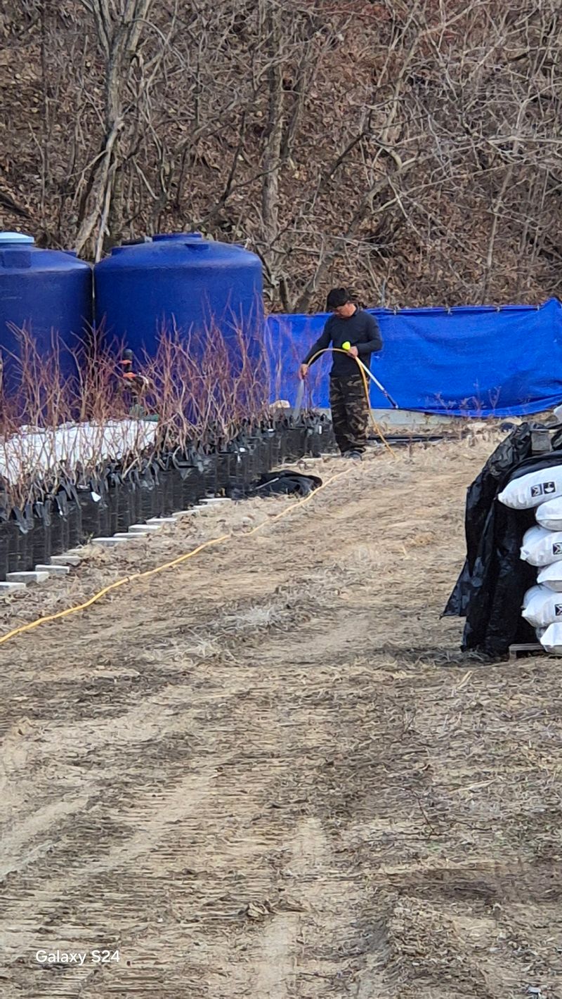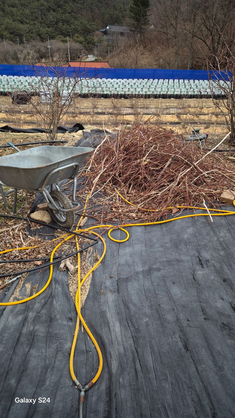 나무 물주려고 점적 호수 점검 엄나무밭 황 뿌리기 미터당 한개주지대 박고 높이 삼십센티 점점호수는 네줄