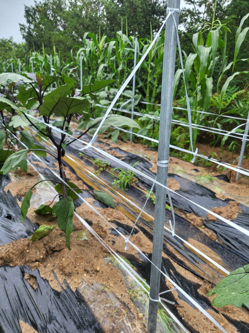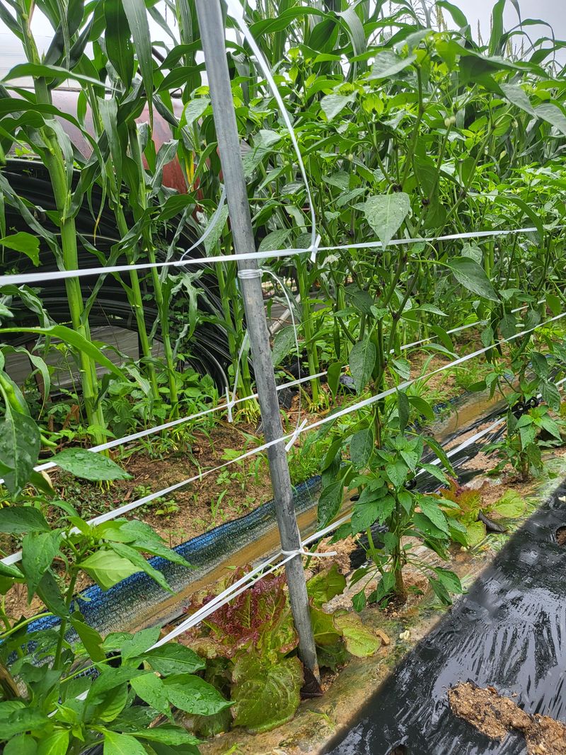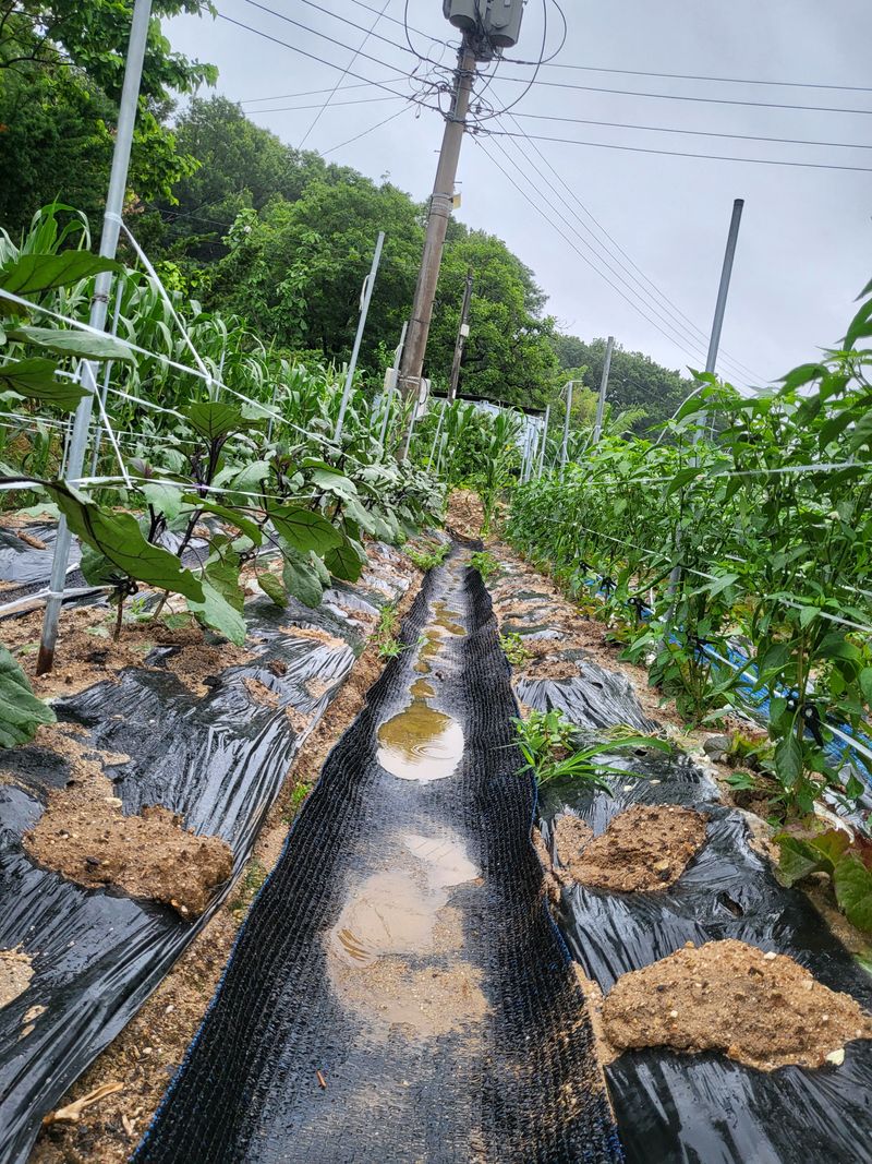 오늘 가랑비 맞으면서 고추.가지 3단 줄 띄웠어요 고추밭에는 틈새에 진딧물 퇴치용으로 동반식물(상추) 심어놨네요