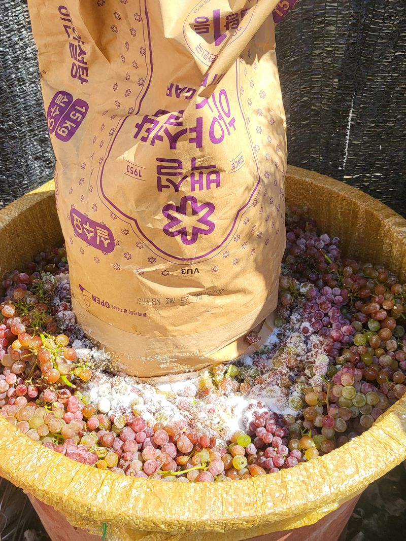포도발효액 만들기했어요 델라웨어는 온도가 높으면 착색이 멈춰요 미쳤다고해요 당도도떨어지고 착색불량으로 품질이 저하되어요 그래서 이렇게 발효시켜서 내년에 관수할때 EM처럼 영양제같이 살포도하고 관주도하면 좋아요 그래서 이렇게 담아서 액체로(1차숙성)변하면 병입해서 2차숙...