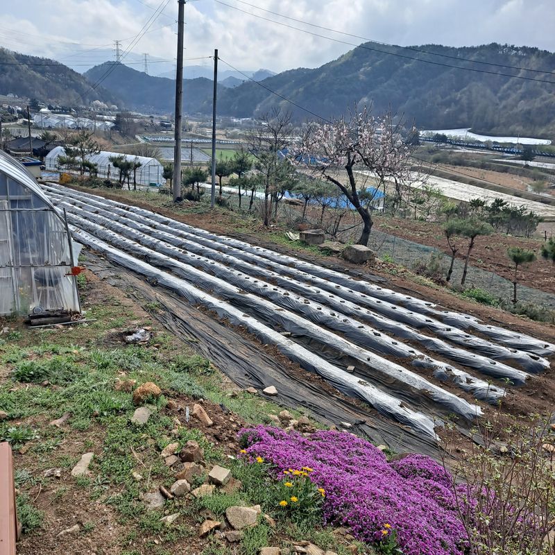 밭갈기.비닐씨우기.감자심기 (240개 ). 옥수수심기(약 80개). 장어.오리백숙.매생이국.생선구이. 상추10.부추6.토마토1 방울토마토1심기. 시금치씨앗구입(5000원) 및 파종
