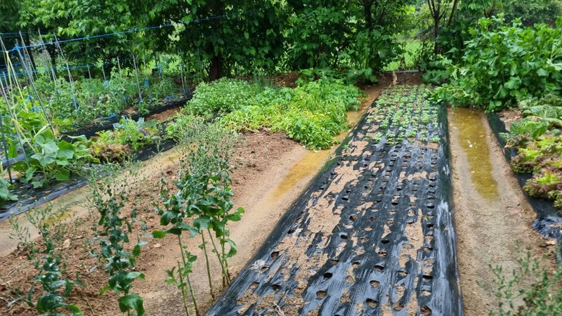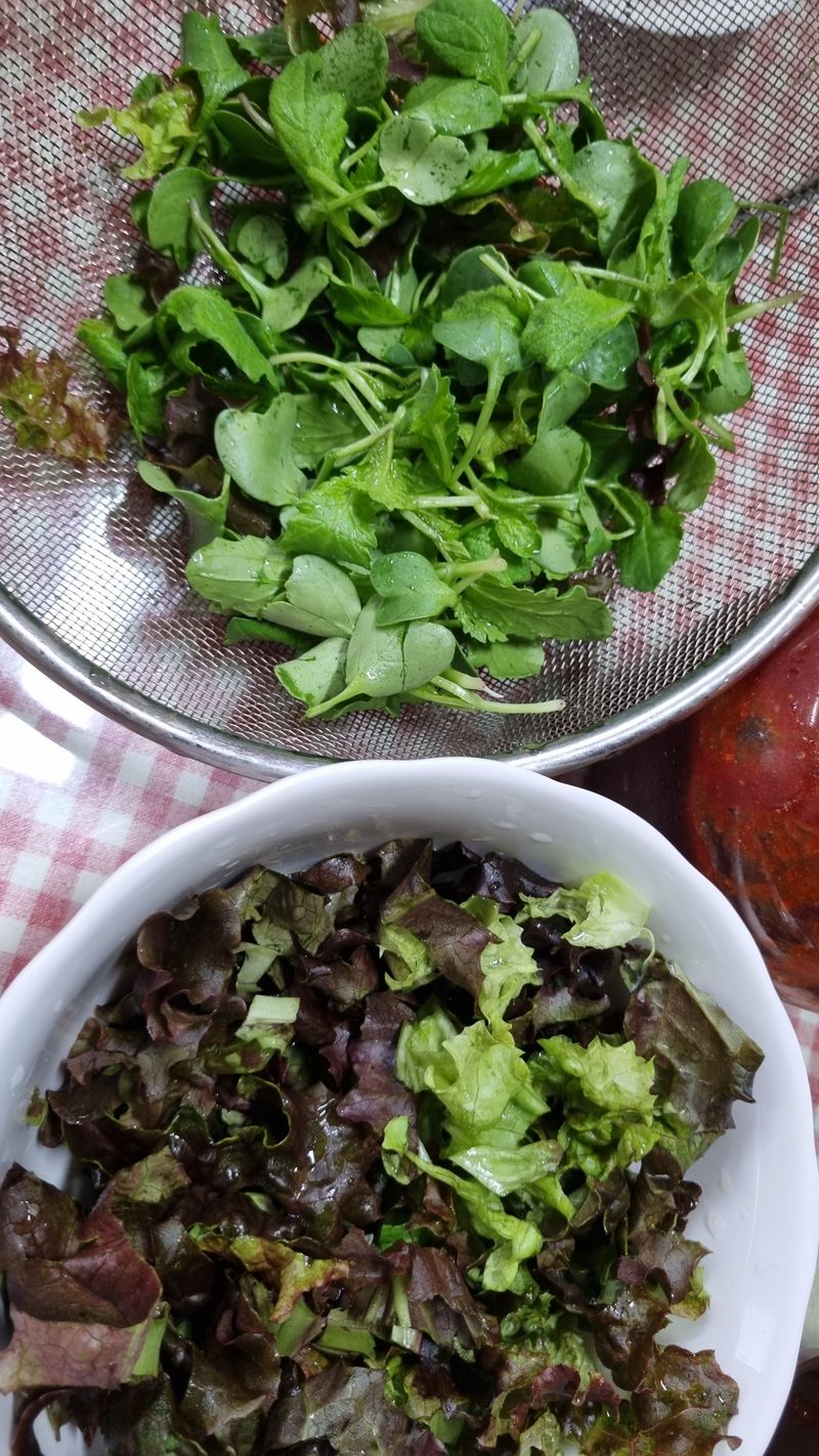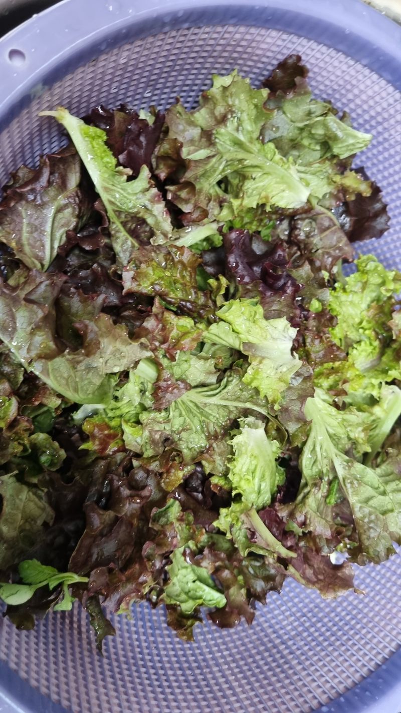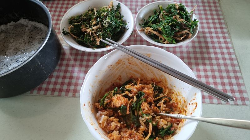 비가 장시 멈춘사이 상추수확하고 열무 솎아 비빔밥으로 점심했다.