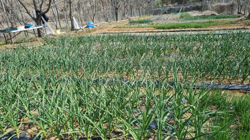오늘은 마늘에 살균제 살충제를 소독 하고 마늘밭 사이 사이 풀도 뽑아줬읍니다.
