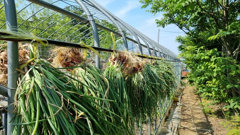 달래파 몇일전 뽑아 놓은것 줄기 자르고 다듬어서 건조하고 있읍니다.