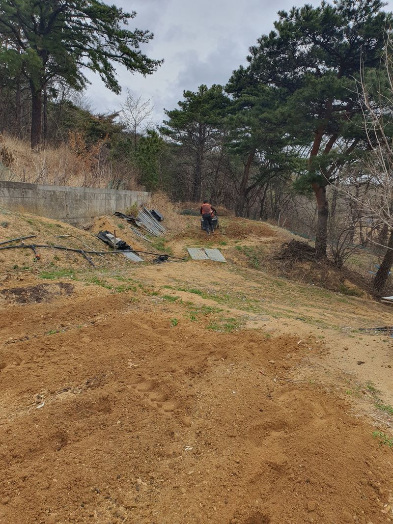메주콩 수확후 마당에 부직포 깔고 펼쳐나았음 배추밭 물주기 콩작업후 비닐걷어 내고 부직포 걷어내고 퇴비 및 비료, 토양살충제, 살균제 뿌려놓음 마늘밭 준비작업
