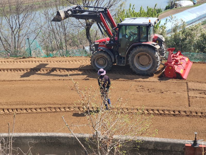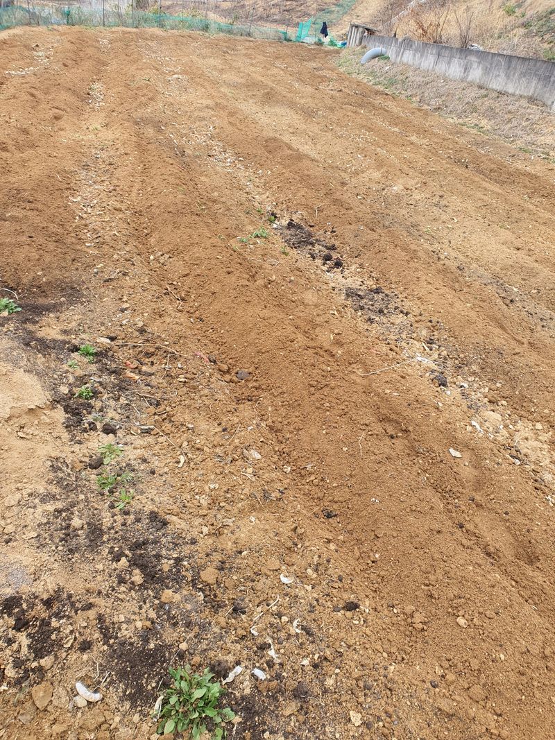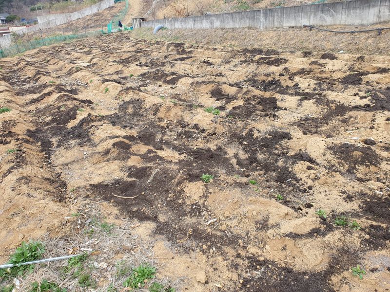 고추밭 석회고토, 퇴비 70포 뿌린후 경운기로 1차 경운