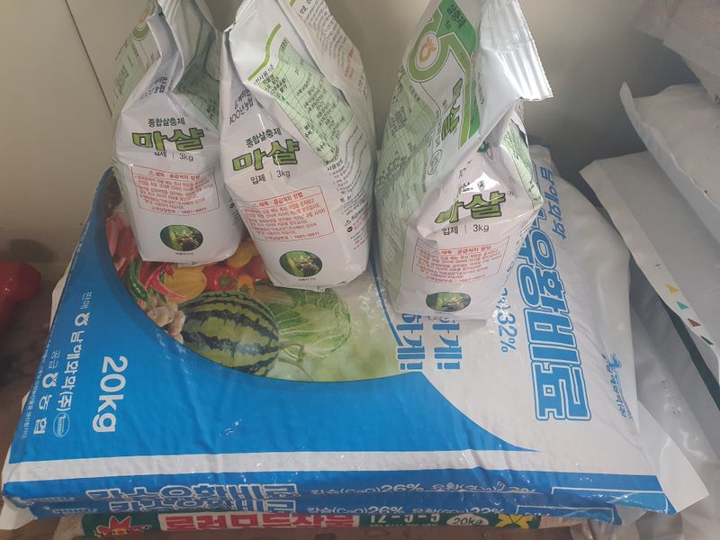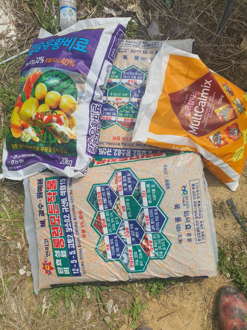고추밭 밑비료 ㅡ칼슘유황비료, 엔피코 완효성비료, 토양살충제 마샬 뿌려줌 마늘밭 추비로 멀티칼믹스 1포 뿌려줌