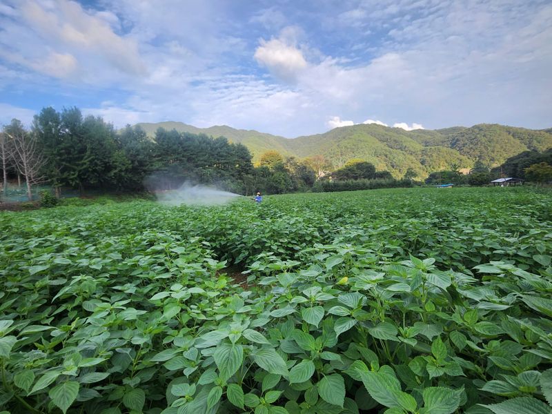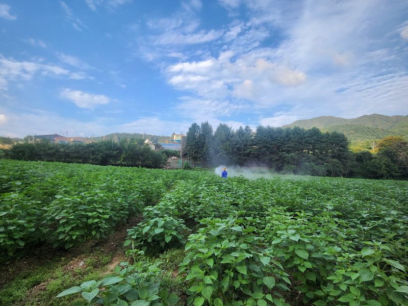 노지에 들깨씨 파종 후 비둘기 오길래 엘산 분무 중간밭 도랑내기