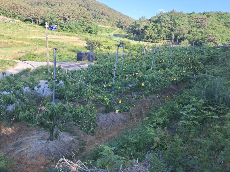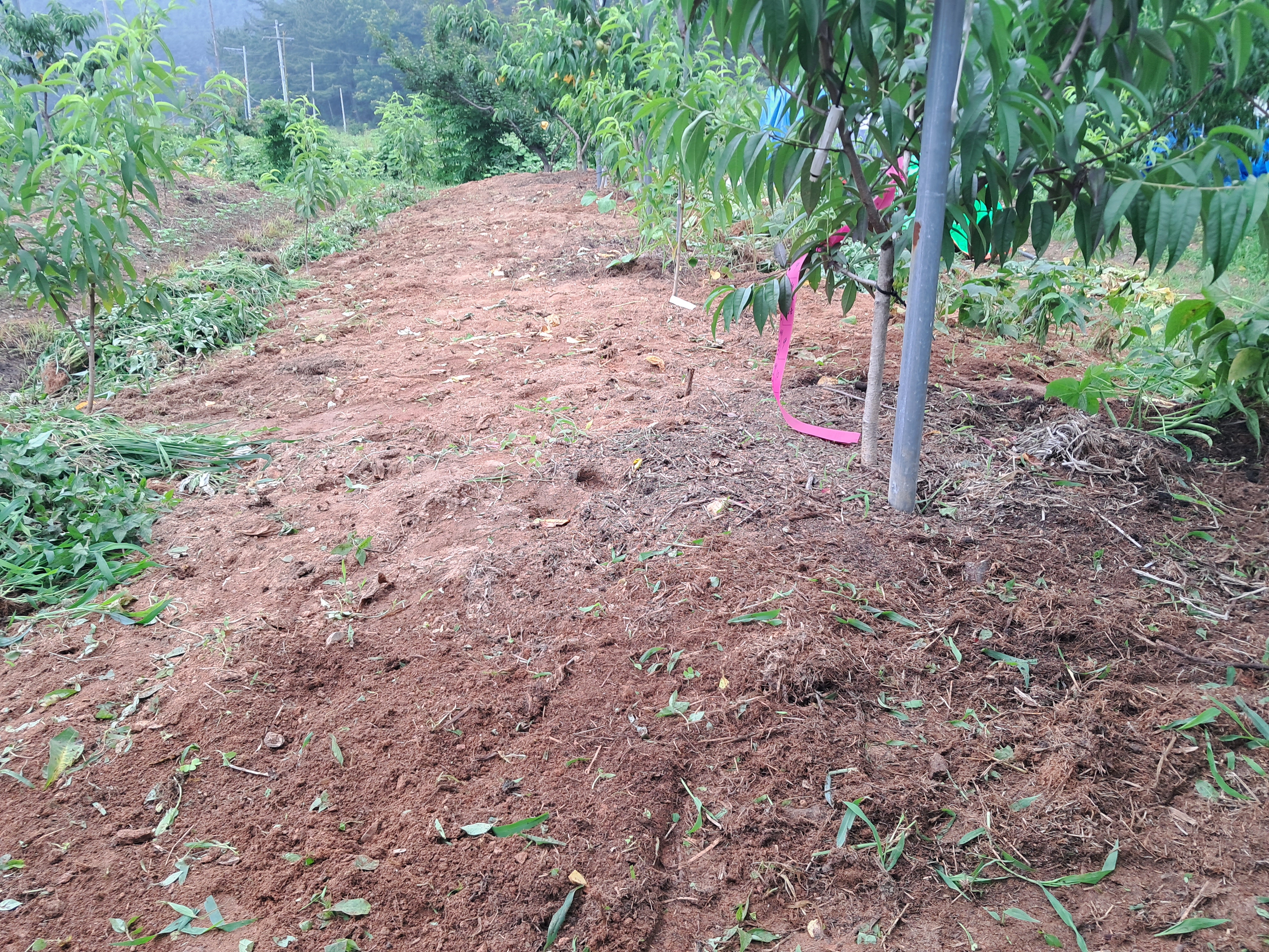 과수원 풀메기 작업 묘목이 풀속에 갇혀있었지만 넘 바쁜일정에 오늘에야 풀메줬네요. 나무가 씨언하다고 웃는거같아요. 장마철이라 낼은 농약예정인데 바람만 없음 실시하려구오. 풀메기전과 후