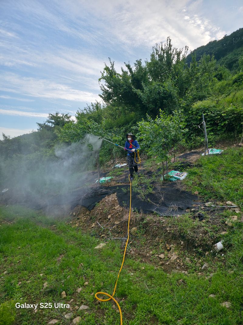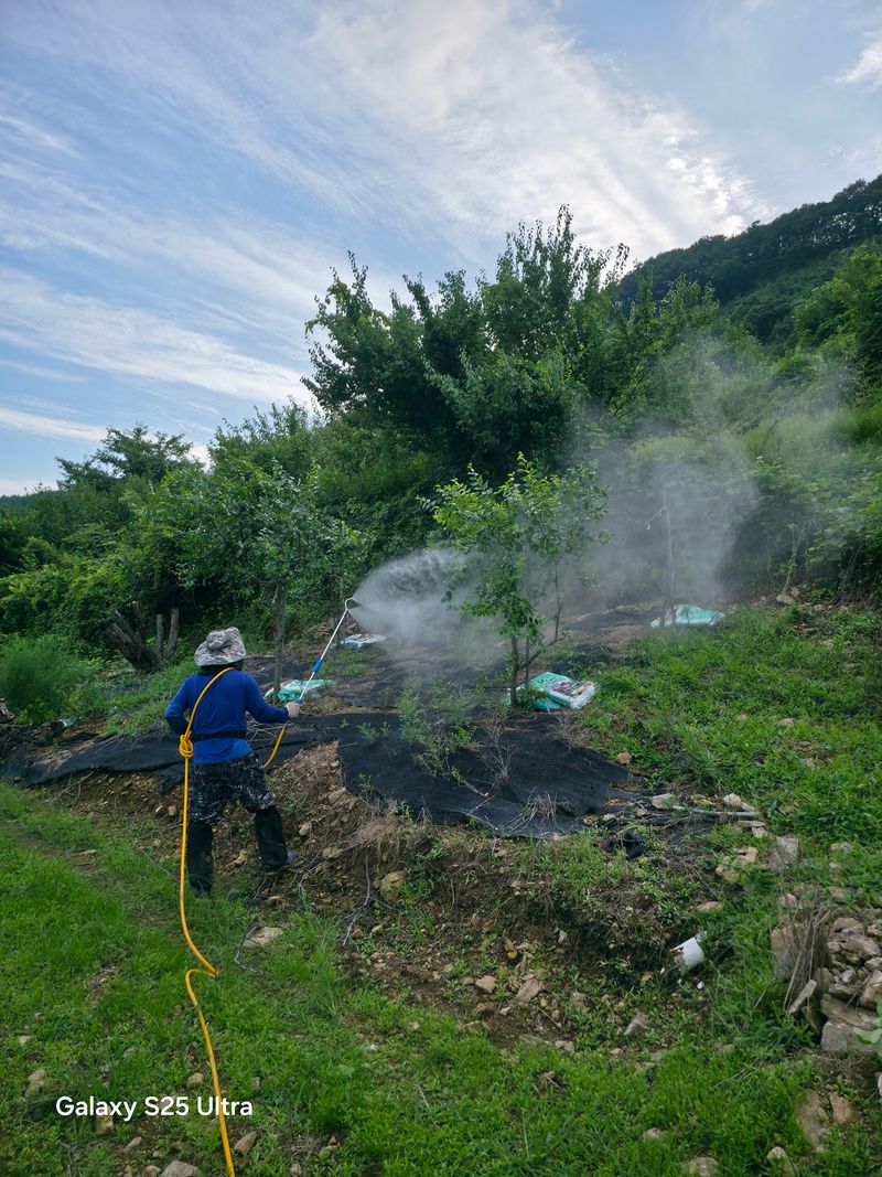 왕대추밭에 잎떨어지지 말라고 약뿌렸네요 올해는 대추가 엄청열였는데 너무많이 열린것이 아닌지 모르갰네요