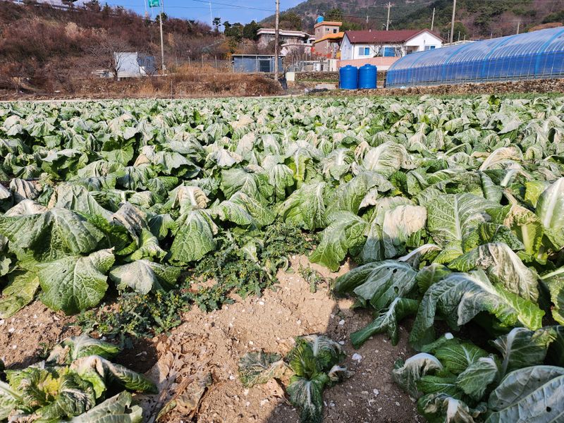 어제 밤에 눈이 내렸내요 수확을 해야하는데 얼어 있어서 수확을 미뤄야 할것 같습니다