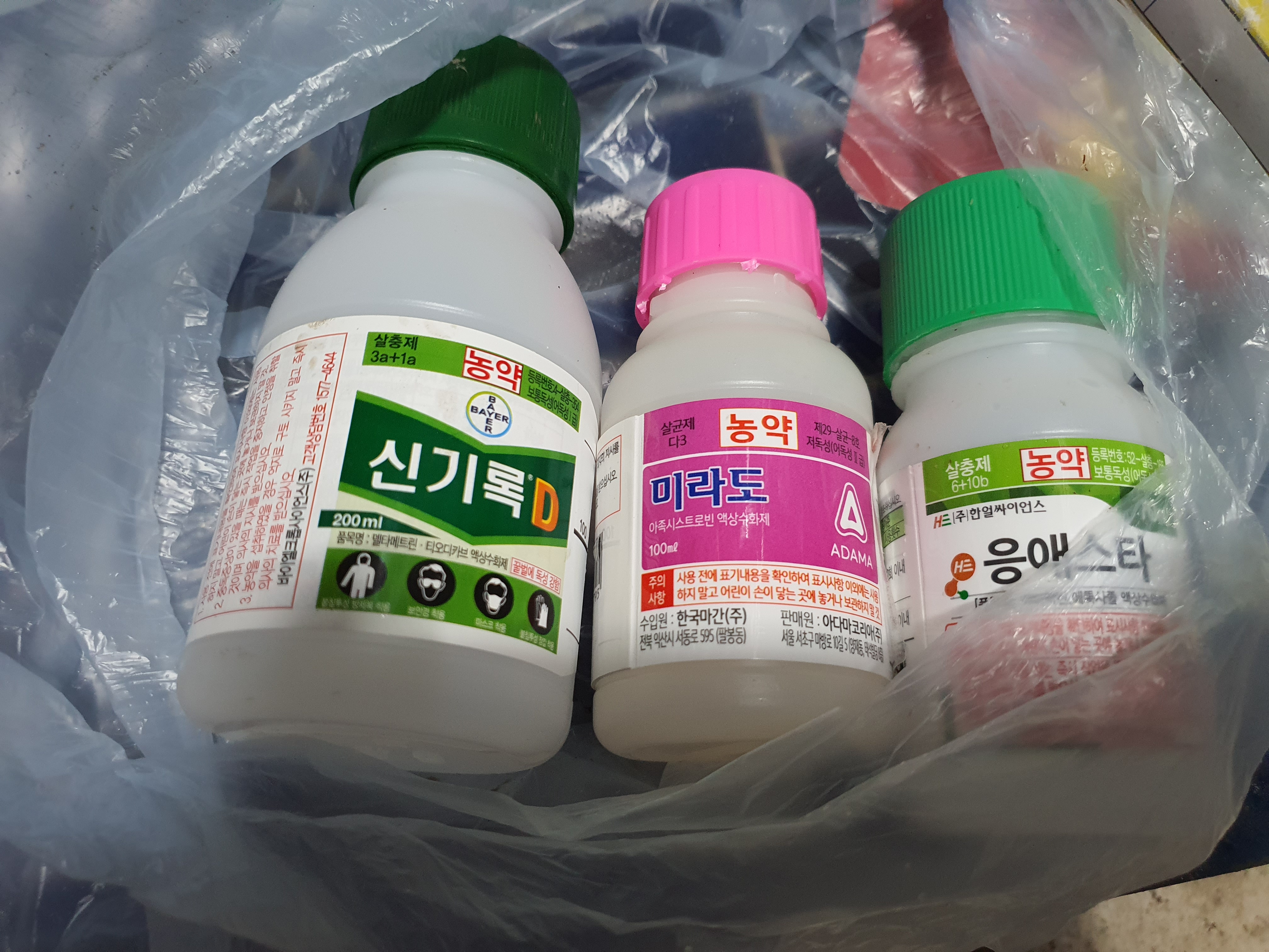 썬모아 (빛 투과 증가제 =>3번 골 이하는 약부족 미살포 비교 확인필요 +미리근 (200g)+마그네슘 300g 200리터 방제 농약 부족1~3골 미방제
