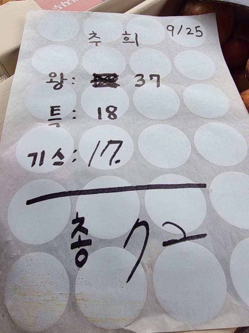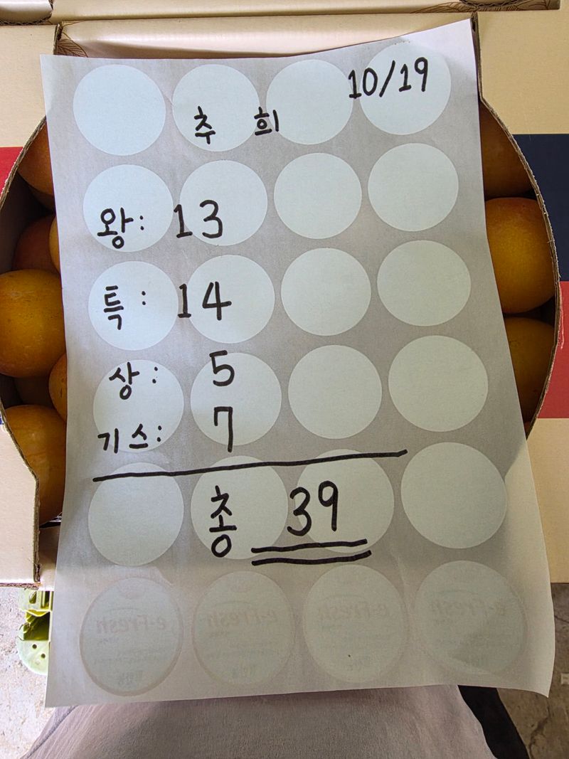 오전 추희 도담밭 21개 수확<완> 추희 산소밭 아래 16개 수확<완> 추희 텃골밭 19개 수확<완> ((올해 추희 총 719박스 수확)) 오후 추희 택배포장