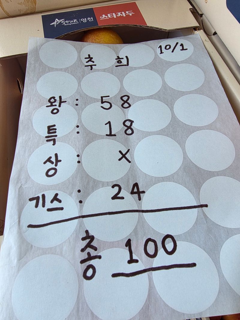 🔶️추희(농라) 10/5 이전으로 판매종료 할 것 클레임 다수 발생 오전 홍옥 익일 공판장 36박스 포장 오후 추희 익일 공판장 111박스 포장 금일 홍옥 공판 시세 40과 1박스 60,- 45과 2박스 65,- 50과 10박스 73,- 55과,60과 18박스 ...