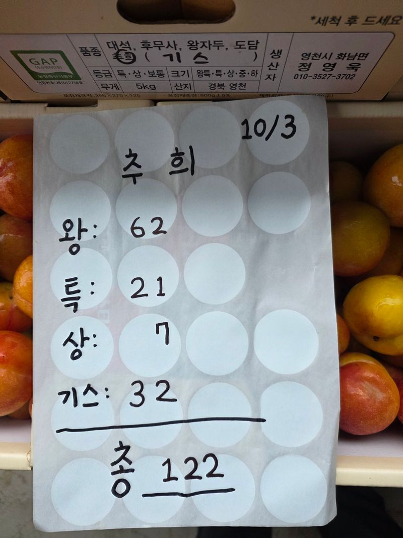 도담밭 18박스 수확 공판장 79박스 포장 개낫 추희 9.5수확