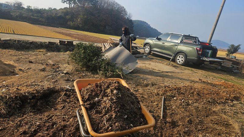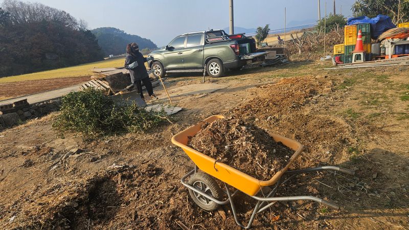 무화과나무 잘라내기 유자나무 5주 옮겨심기 고추대 정리등 외가집 누나한테 고추대 파쇄작업 주민자치센타에 신청 요청함