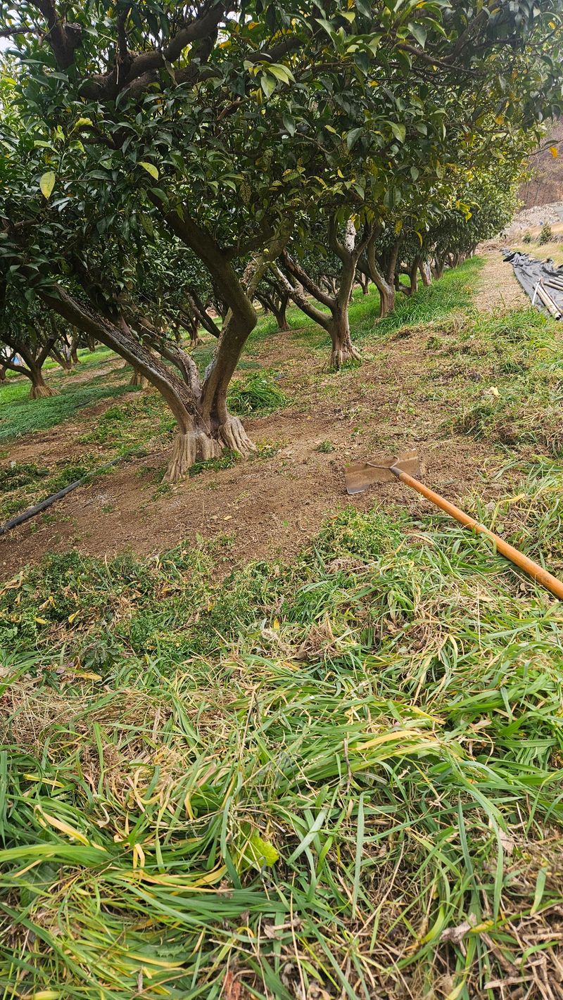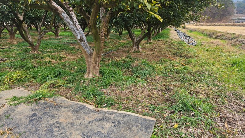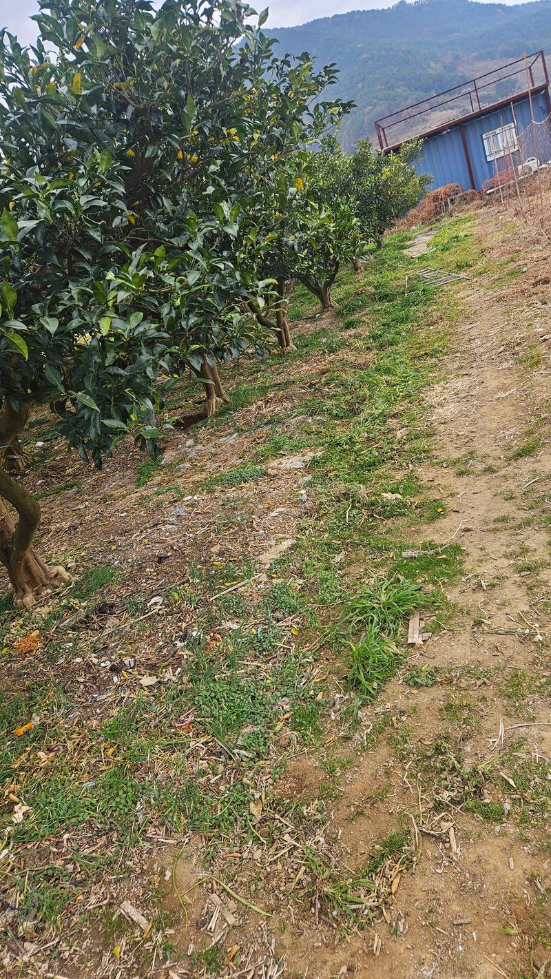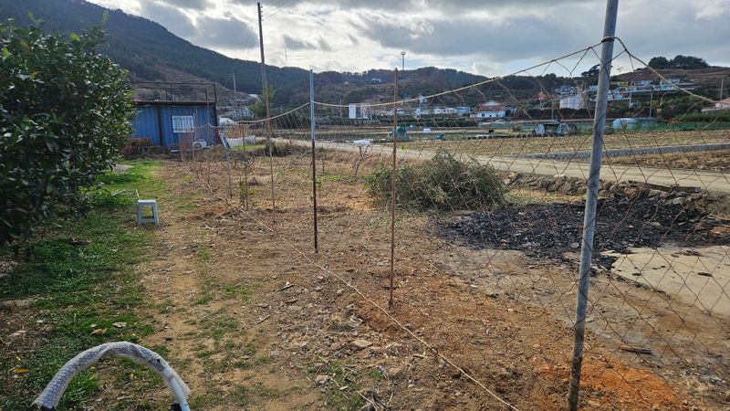 매실나무 전체 톱질하여 잘라내기 도로쪽 해태망 설치 준비작업 기초석 땅파스묻고 파이프 고정하고 출구쪽 지지대 빨강색으로 도색 열로우 팜 유자공장 대푠랑 인사하고 유자청 1k 2병 얻음 하천공사