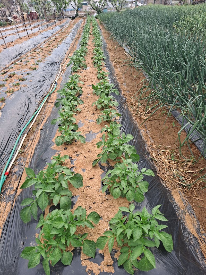 감자 마늘 양파 고추 땅콩 상추 등등 잘 자라고 있네요. 옥수수도 완두콩도 강낭콩도 다들 쑥쑥 자라고 있어요
