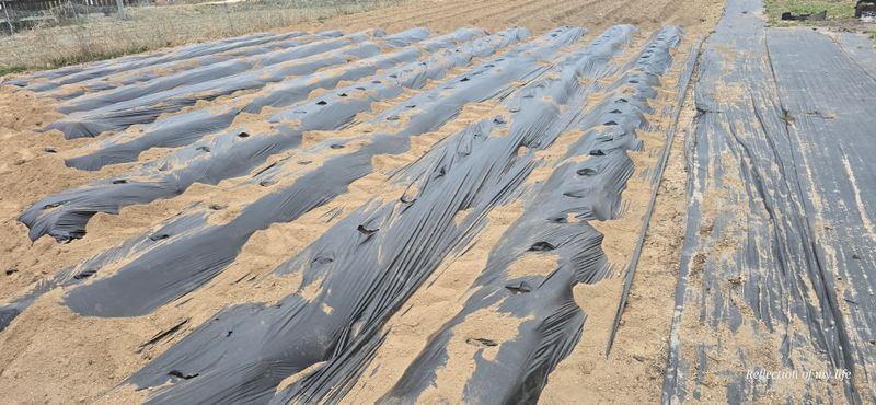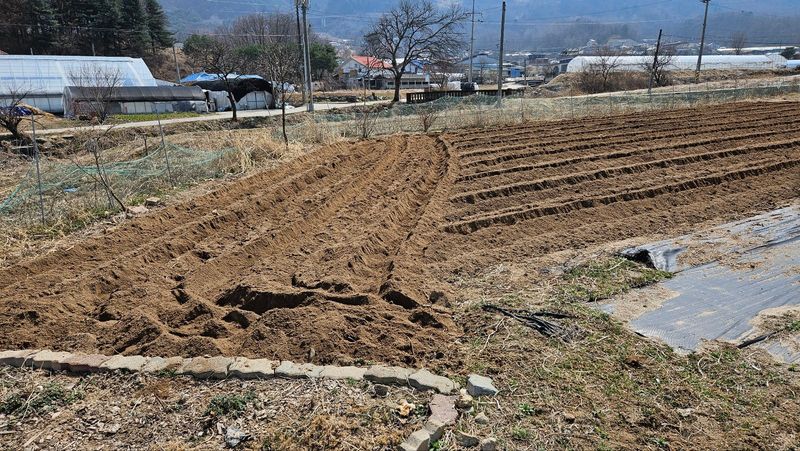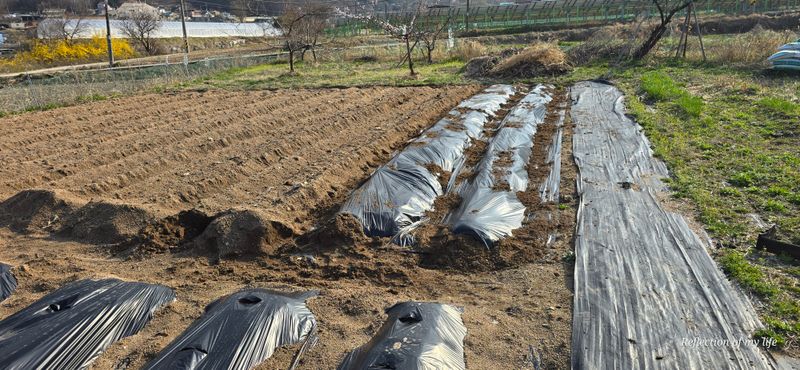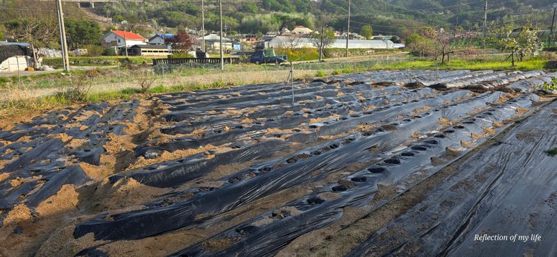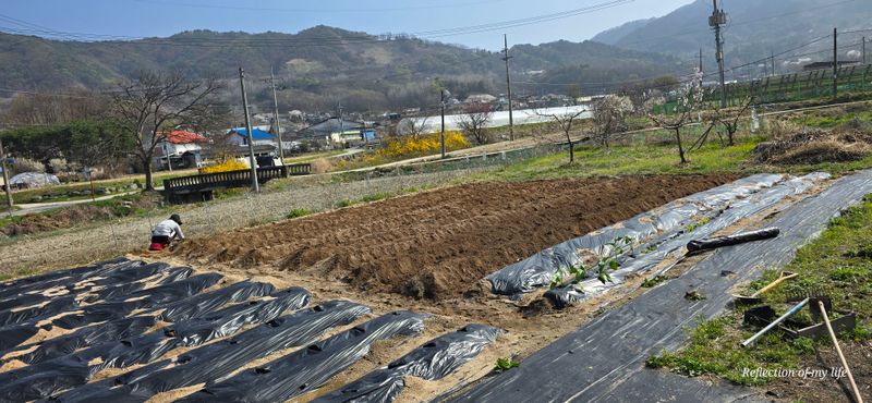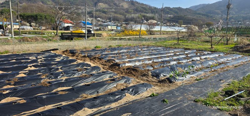 멀칭 3줄 남겨놓고 오늘은 마무리 과실나무 농약치고 대파와 상추 심기