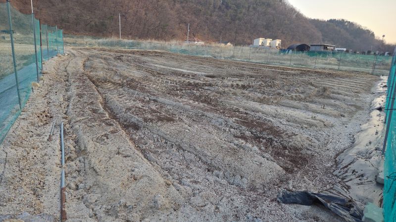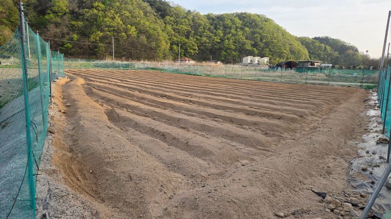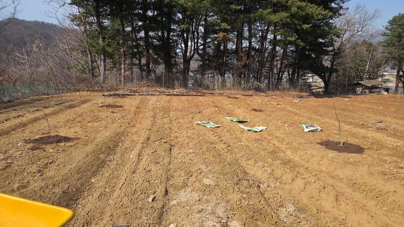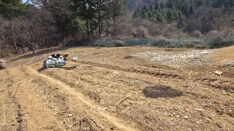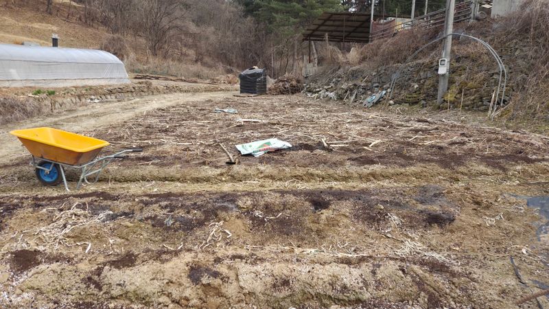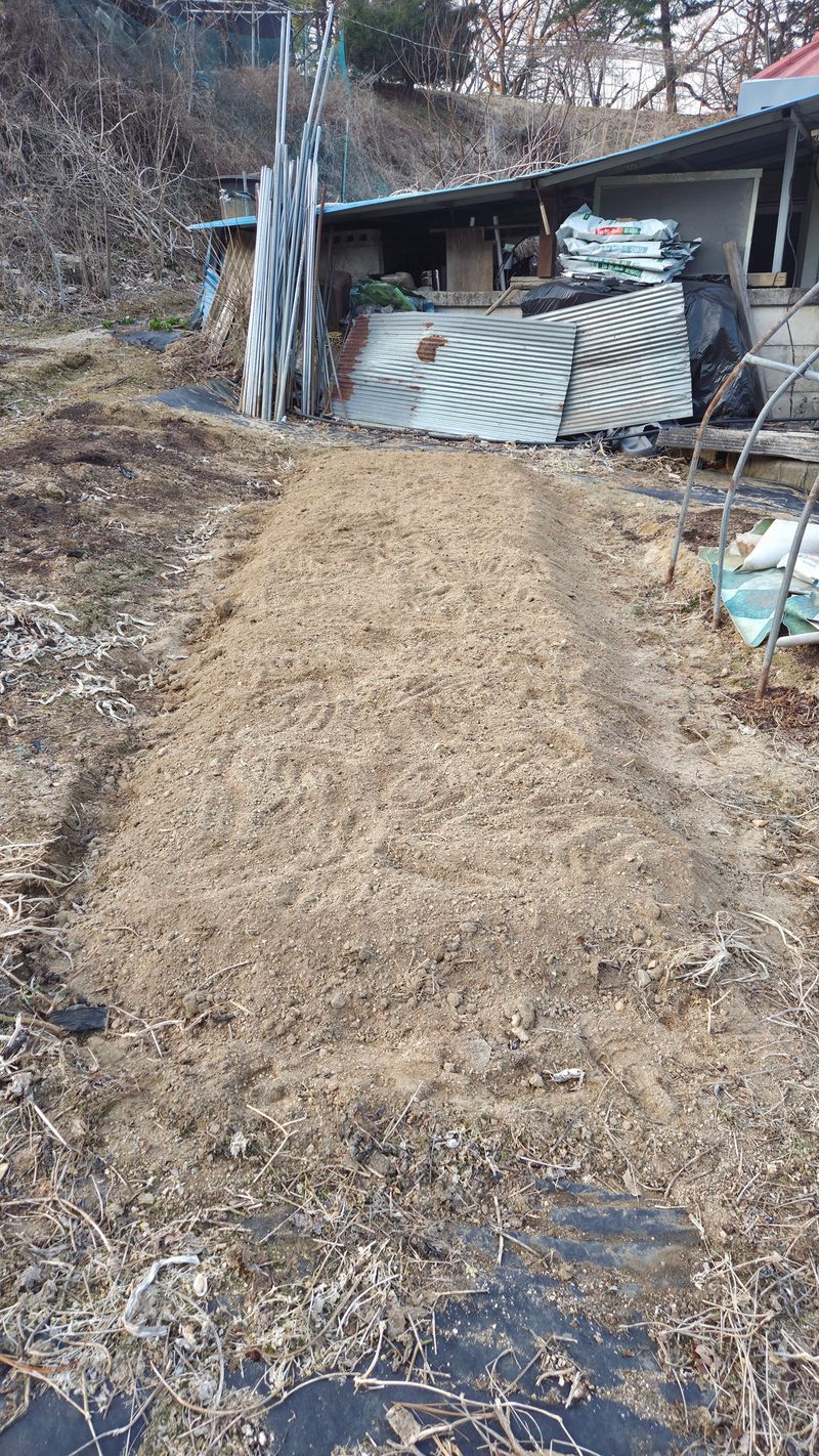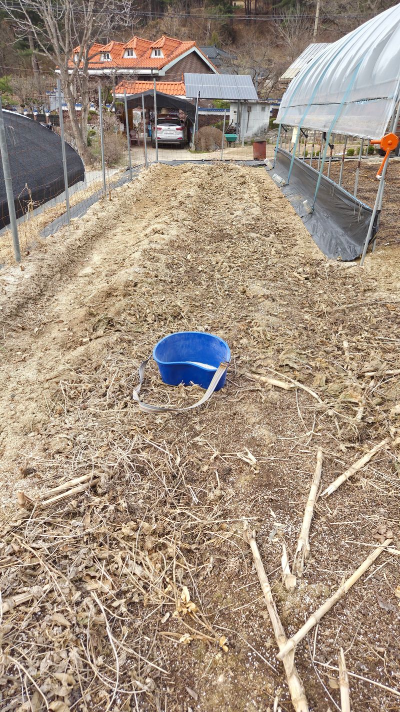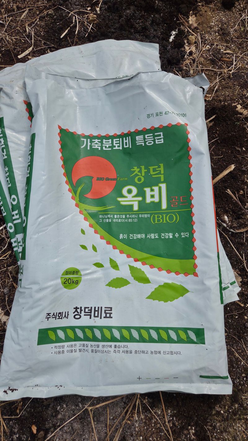 앞밭마사토평탄작업 고토비료1포살포 유박비료 살포 뒷밭 계분 퇴비 살포